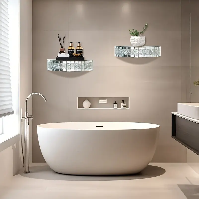 1Pc Semicircular Mirrored Floating Shelves for Wall Decor Storage, Glamorous Crystal Crush Diamond Decorative Wall Shelf, Glitter Glass Wall Mounted Shelves for Bedroom, Living Room, Bathroom, Kitchen, Office and More, Silver