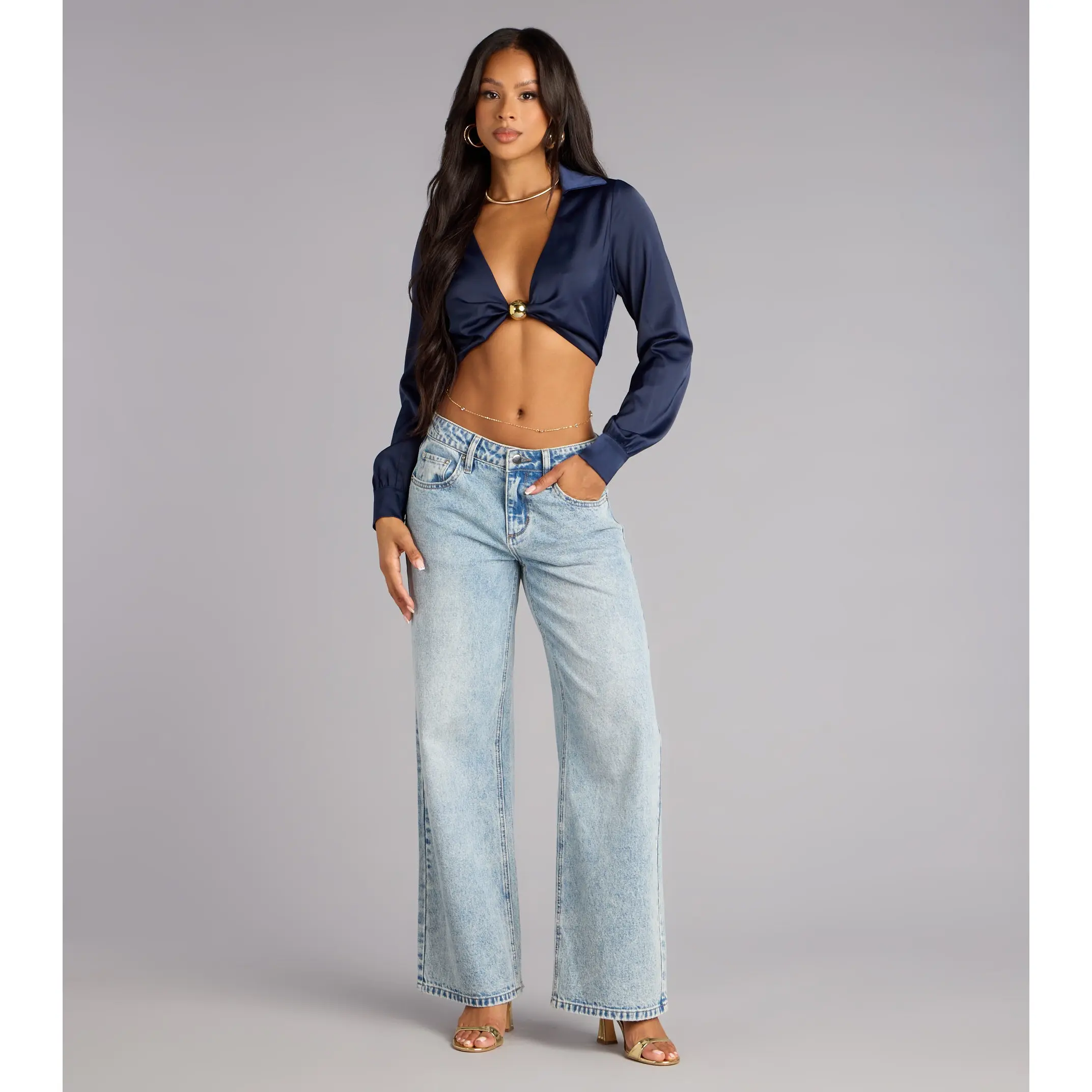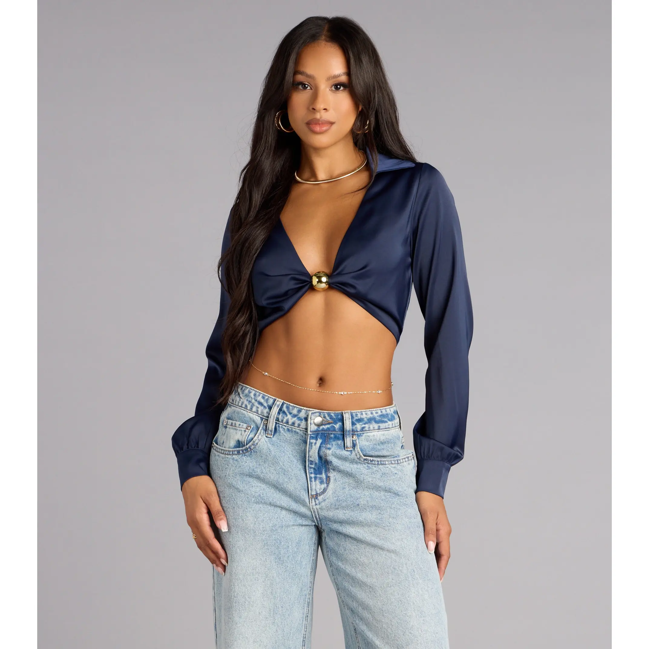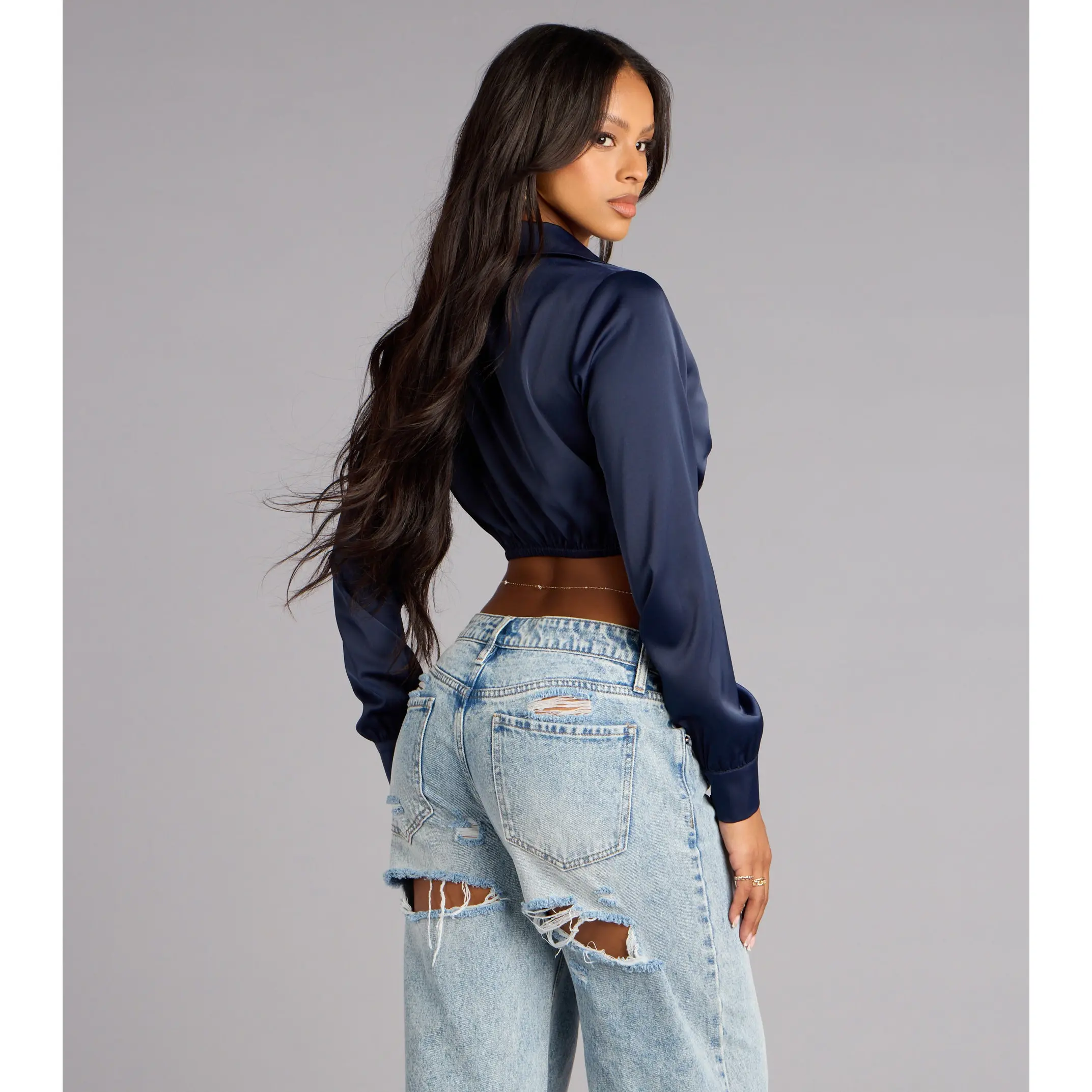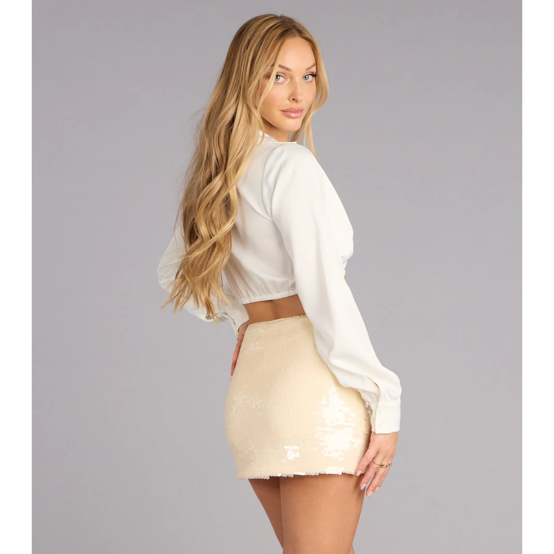 Serving glam with a tailored twist. This satin crop top brings sleek sophistication with just the right amount of skin, perfect for girls’ night or that chic dinner vibe.