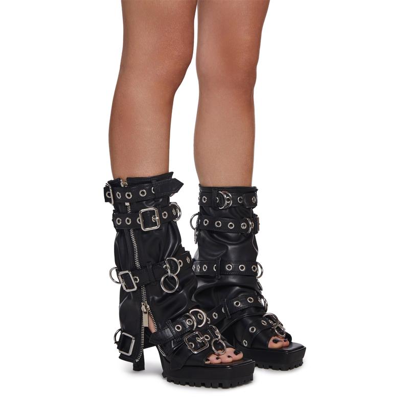 These shoes have a vegan leather construction, metal hardware uppers, treaded platform soles, block heels, and comes with a detachable zip off attachment with grommet and buckle details.