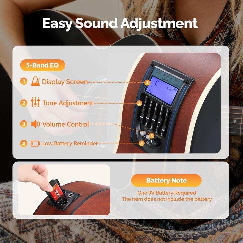 CONSIDERATE FEATURES: In addition to the on-board 5-band EQ with low-battery-display which can freely adjust bass, mid-range, treble and presence. Just need to install one 9V battery (not included) on the bottom of the guitar and it's ready to use.