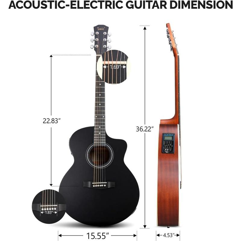 UNIQUE DESIGH: The 6 strings 36-inch acoustic electric guitar uses cutaway design: a cut at the junction of the body and neck makes the treble frets easier to reach when playing. The smooth body and neck of the guitar gleamed with a subtle sheen, becoming even more elegant and dazzling under the light.