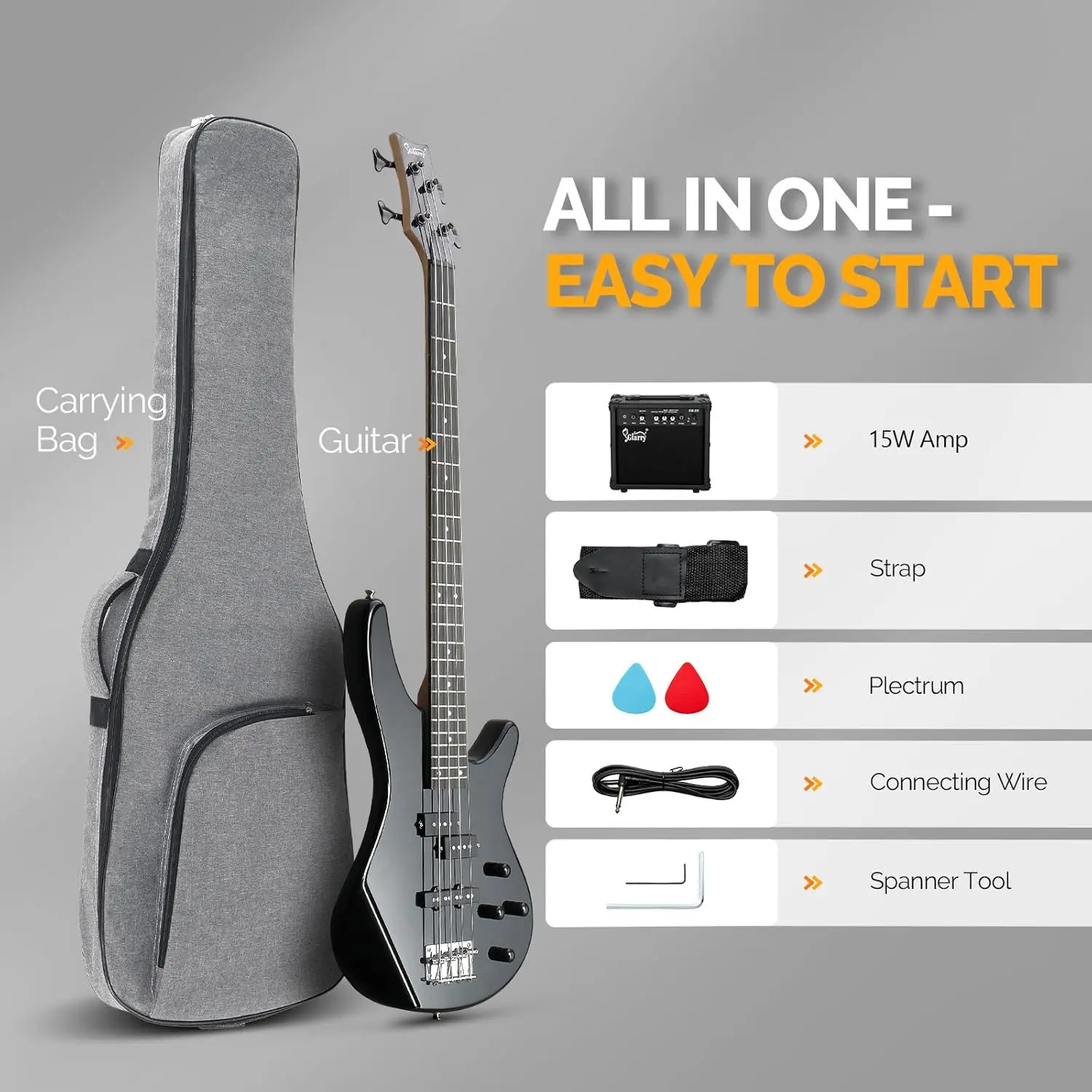 GLARRY 4 String Electric Bass Guitar Beginner Kit,GIB Series Full Size Solid Body Bass Guitar with 20W AMP, Gig Bag Backpack and Accessories (Black)