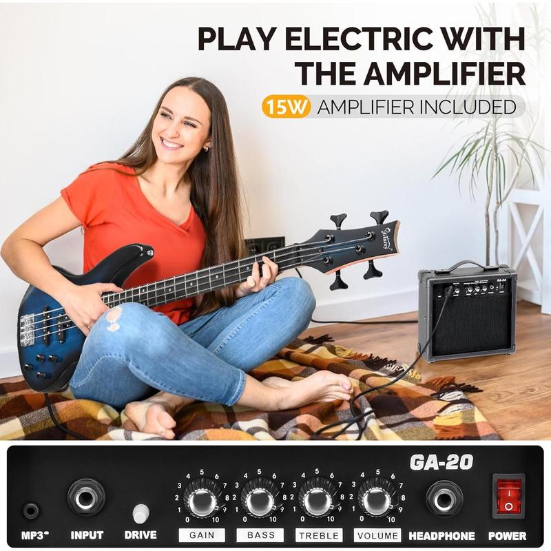 PERFECT ACCESSORIES: Come with 1× Electric Bass Guitar, 1 x Amplifier, 1× Portable Guitar Bag, 1× Shoulder Strap, 1× Bass Pick, 1× Amp Cord. You can play our bass immediately after opening a package. The full size bass guitar is a ideal gift for beginners and suits aspiring musicians too.