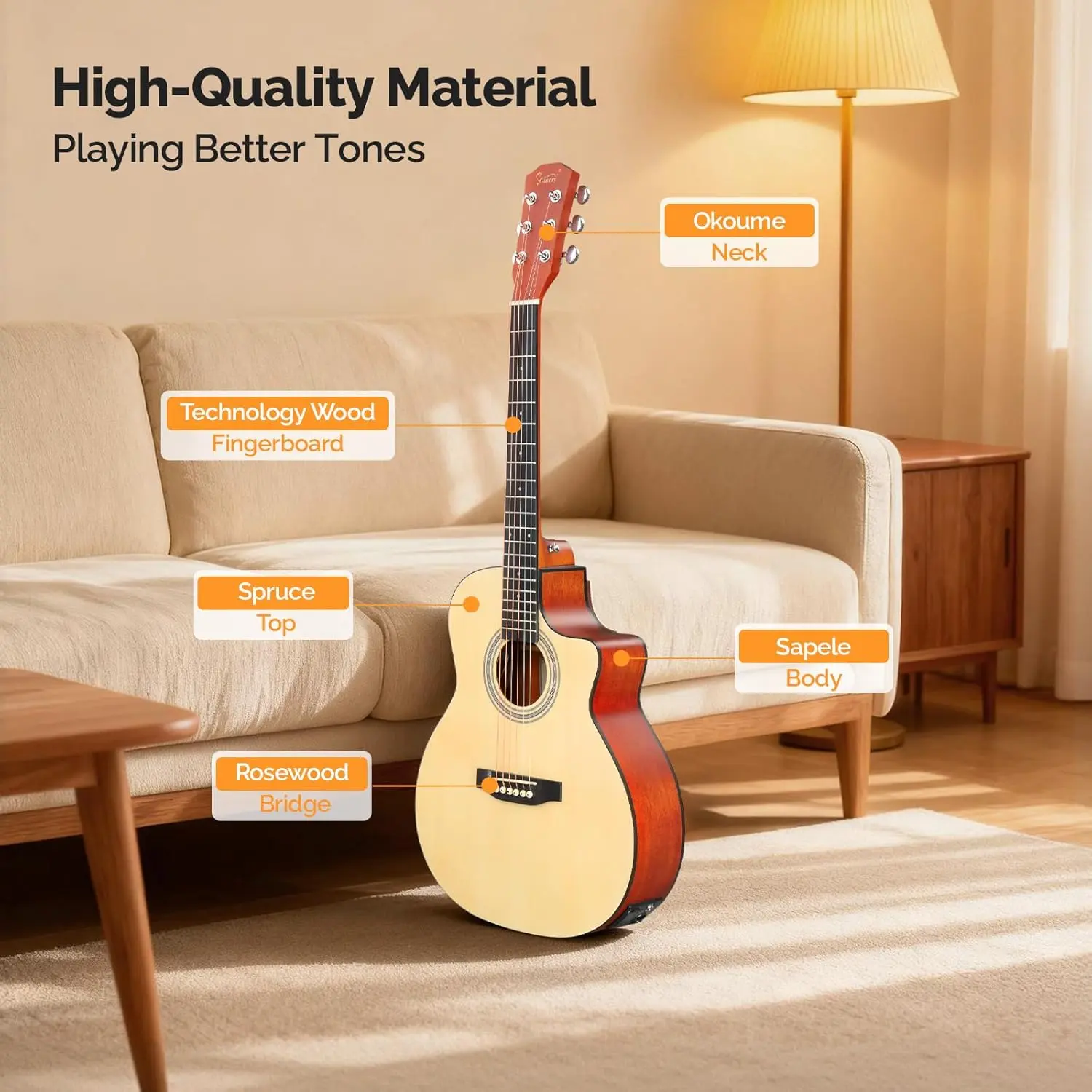 UNIQUE DESIGH: The 6 strings 36-inch acoustic electric guitar uses cutaway design, a cut at the junction of the body and neck makes the treble frets easier to reach when playing. The smooth body and neck of the guitar gleamed with a subtle sheen, becoming even more elegant and dazzling under the light.