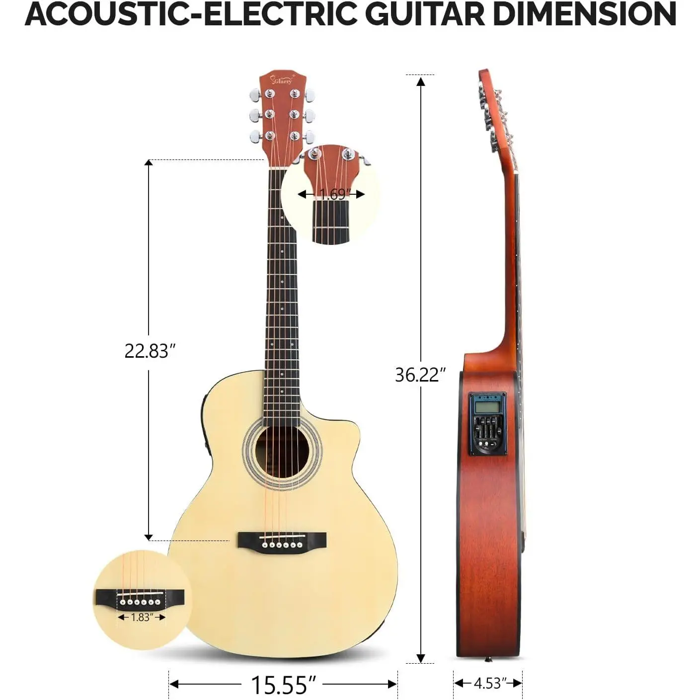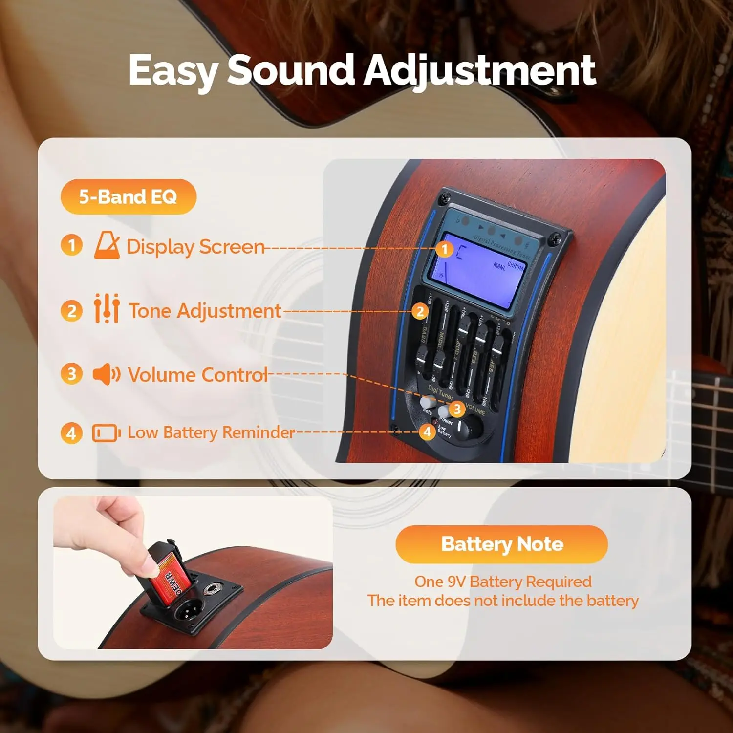 CONSIDERATE FEATURES: In addition to the on-board 5-band EQ with low-battery-display which can freely adjust bass, mid-range, treble and presence. Just need to install one 9V battery (not included) on the bottom of the guitar and it's ready to use.