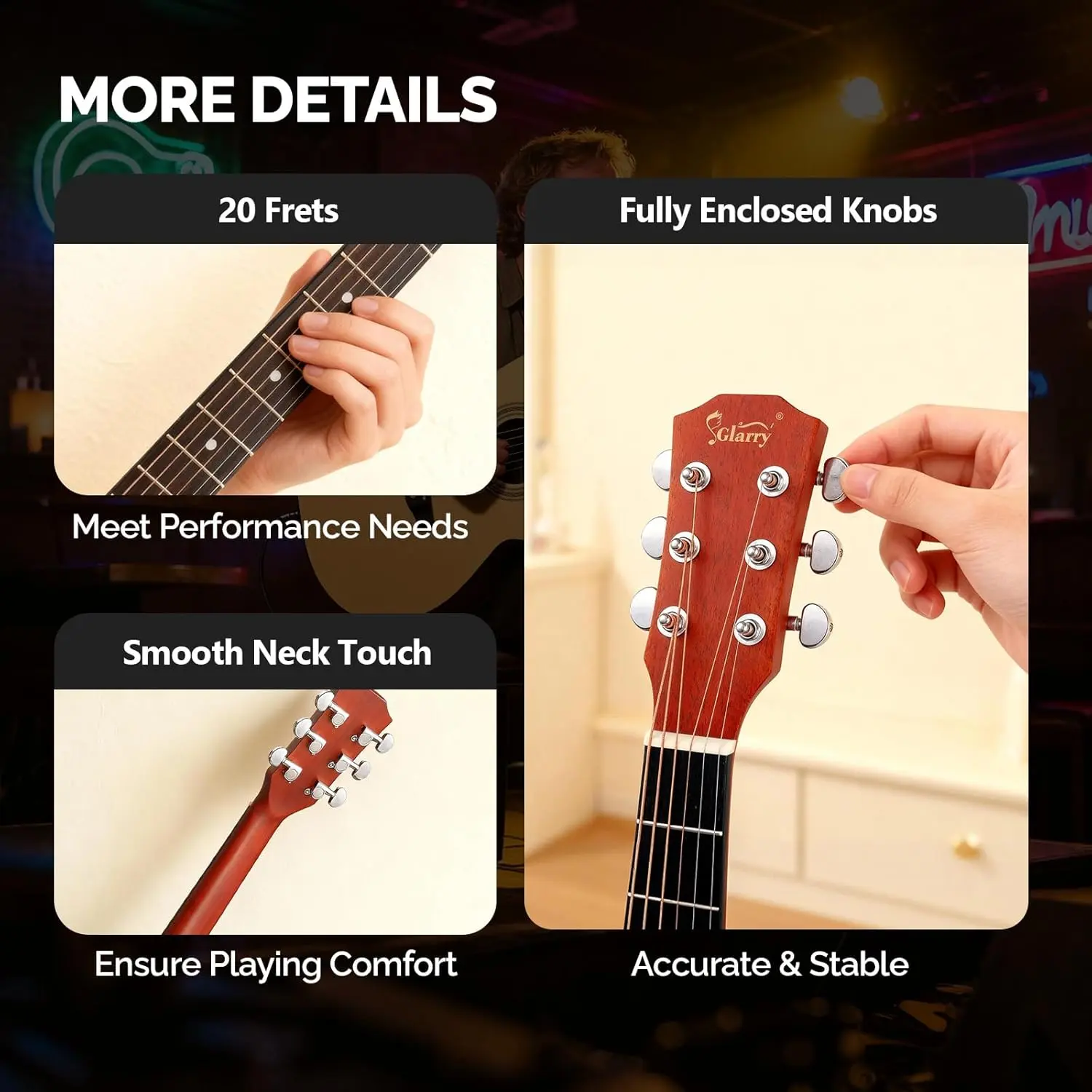 DURABLE USE SETTING: Every guitar is equipped with a pick-guard to prevent the top-board from being scratched by picks while playing the guitar. Use the wrench to adjust the neck to remain it straight in different temperature. The premium wood materials and the rust-resistant strings allow this guitar to be used for years to come.
