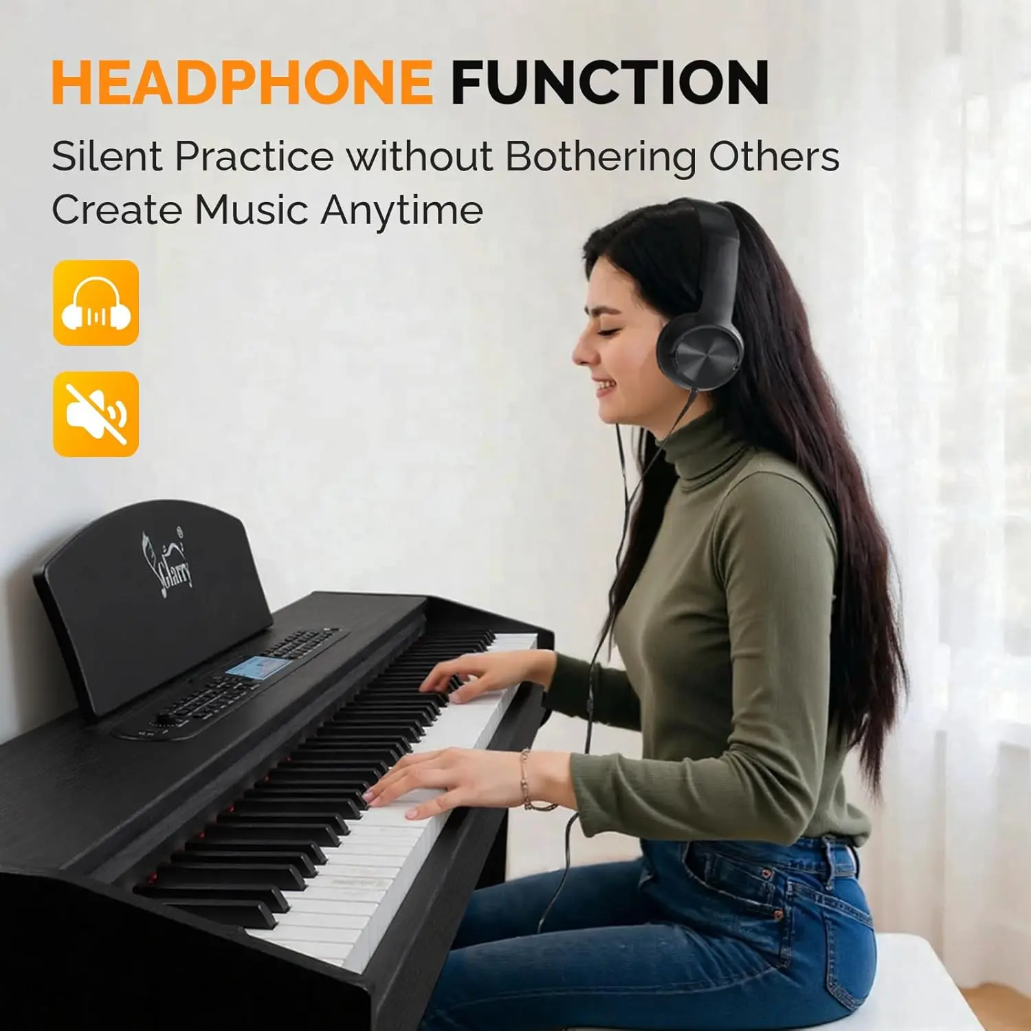 Fully Equipment and Facilities: The digital piano is equipped with a headphone, a adapter,a piano cover cloth, key stickers, a music clip, a USB cables. With the headphone, you can practice or create the music silently anytime even late night without bothering others. Others thoughtful gadgets such as key stickers can help you adapt to piano use faster, brings you more convenient experience.You can send the digital piano as a gift to your family or friends.