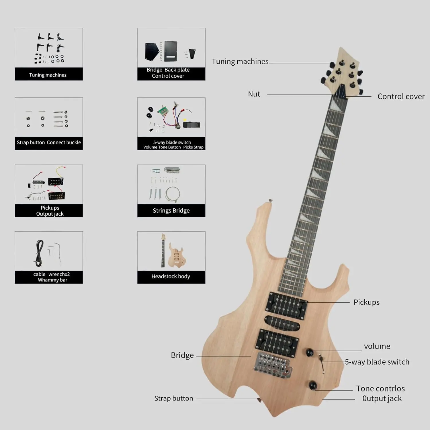 All Components Included: Our DIY guitar kit contains all the necessary components, contains pre-cut wood pieces for the body and neck, hardware such as tuning machines and bridge, electronics including pickups and control knobs, and all necessary small parts like screws and wires.