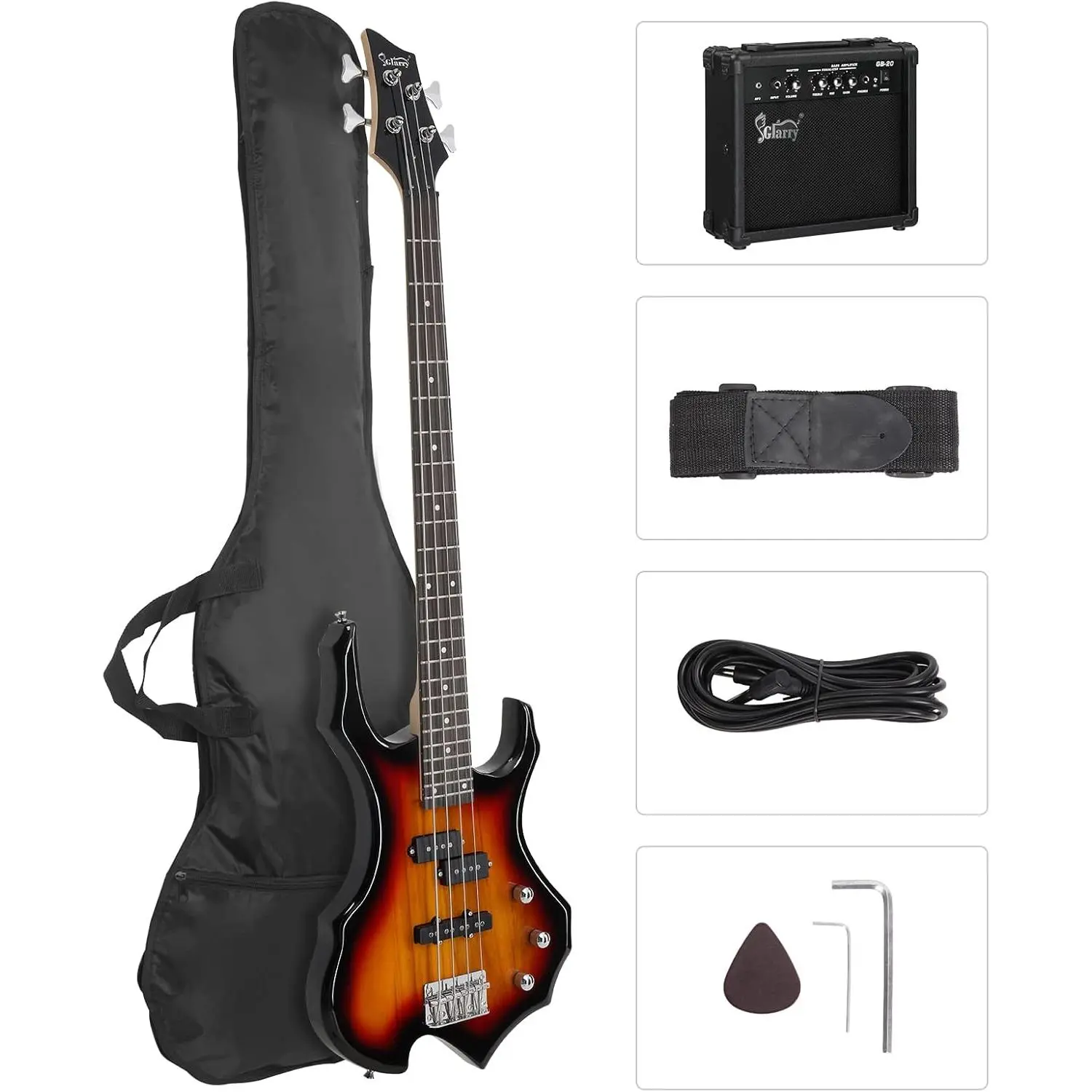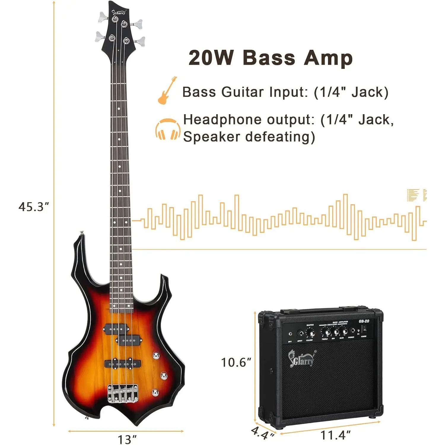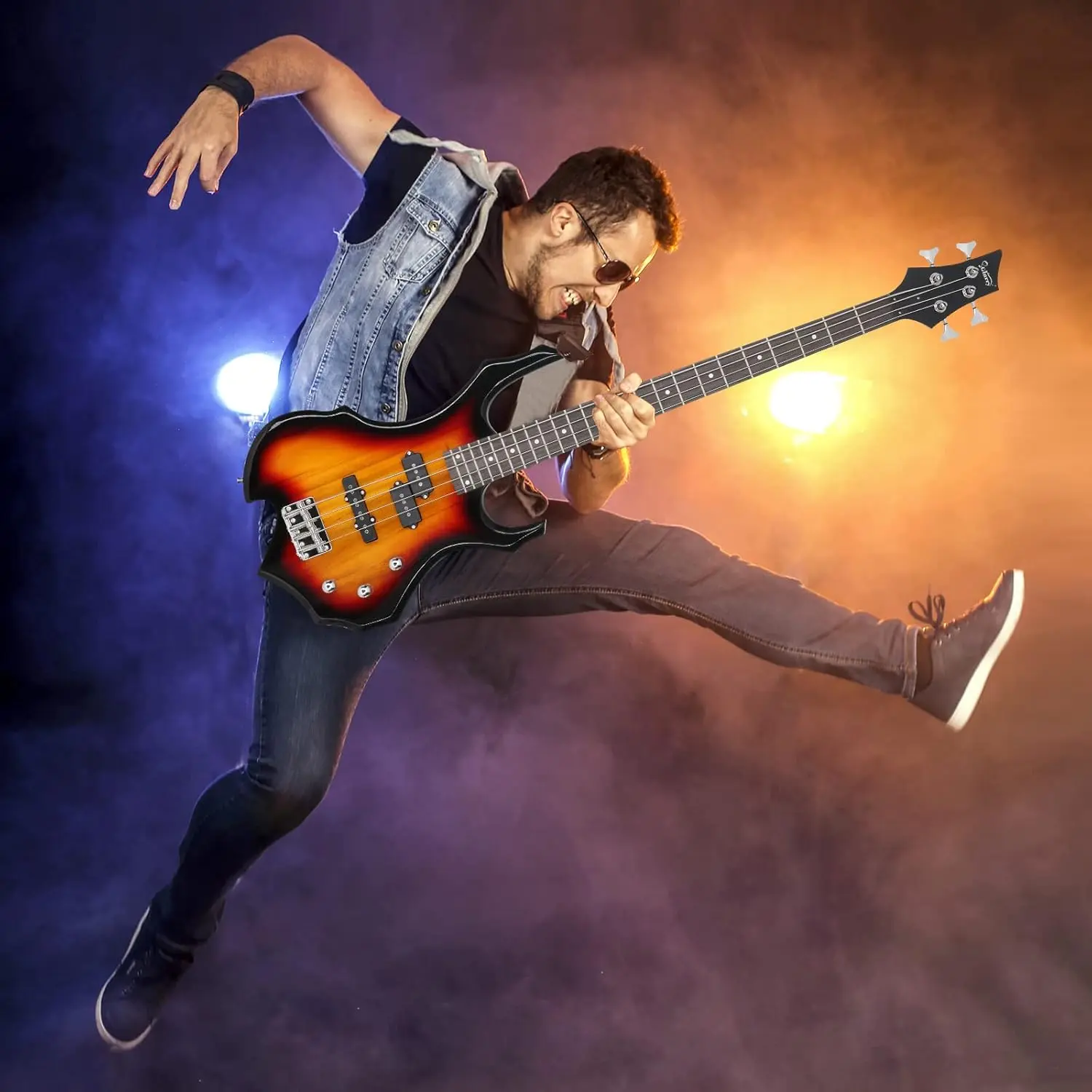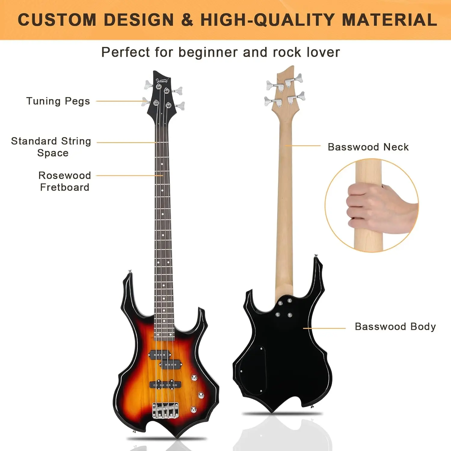 PERFECT ACCESSORIES: Come with 1× Electric Bass Guitar, 1× Portable Guitar Bag, 1× Shoulder Strap, 1× Amp Cord, 1× Wrench Tool,1× Plectrum. You can play the burning fire bass immediately after opening a package.