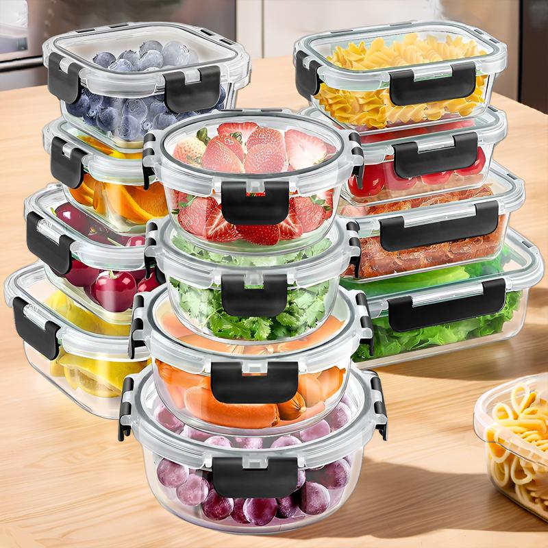 12pcs Glass Food Storage Containers with Leak-Proof Airtight Snap-Lock Lids. Made from borosilicate glass, these containers feature silicone seals for leak-proof closure. Safe for microwave, oven, freezer, and dishwasher. Ideal for storing leftovers, snacks, vegetables, grains, and full meals. High-temperature resistance ensures safe reheating or baking. No cracking or warping in the freezer. Easy to clean and space-saving, nesting and stacking neatly for organized storage.