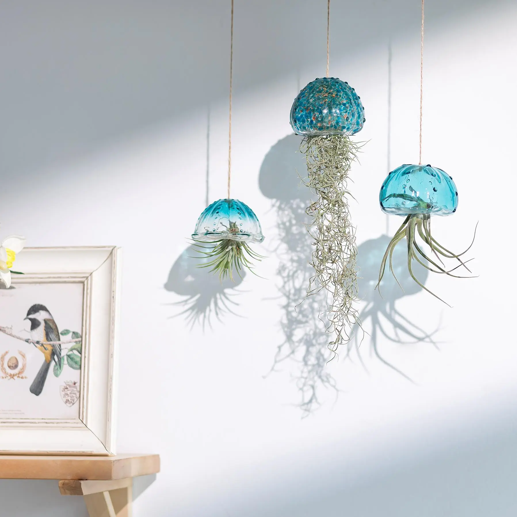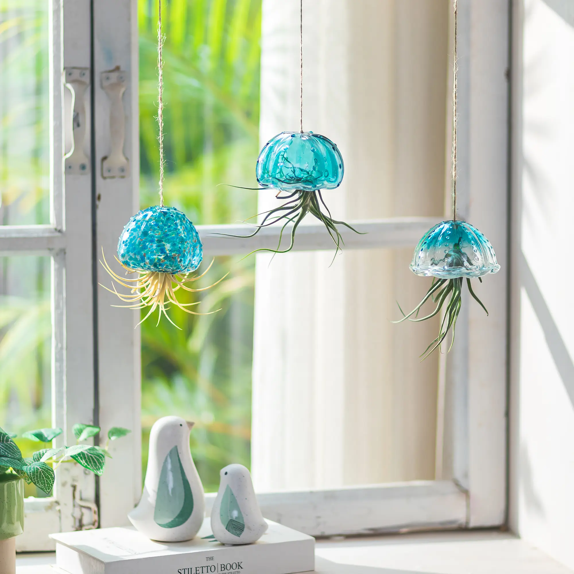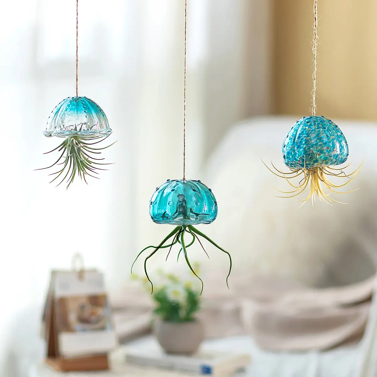 Three distinct jellyfish-designed air plant displayer, handcrafted by artisans using traditional glassblowing techniques. Each piece is carefully shaped with vibrant colors through manual pigment dipping and blown from robust soda-lime glass, ensuring enhanced thickness and long-lasting durability.