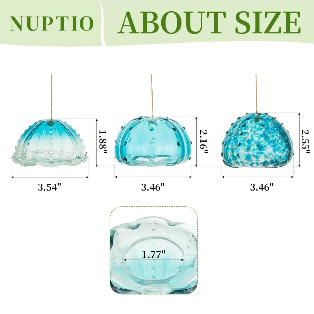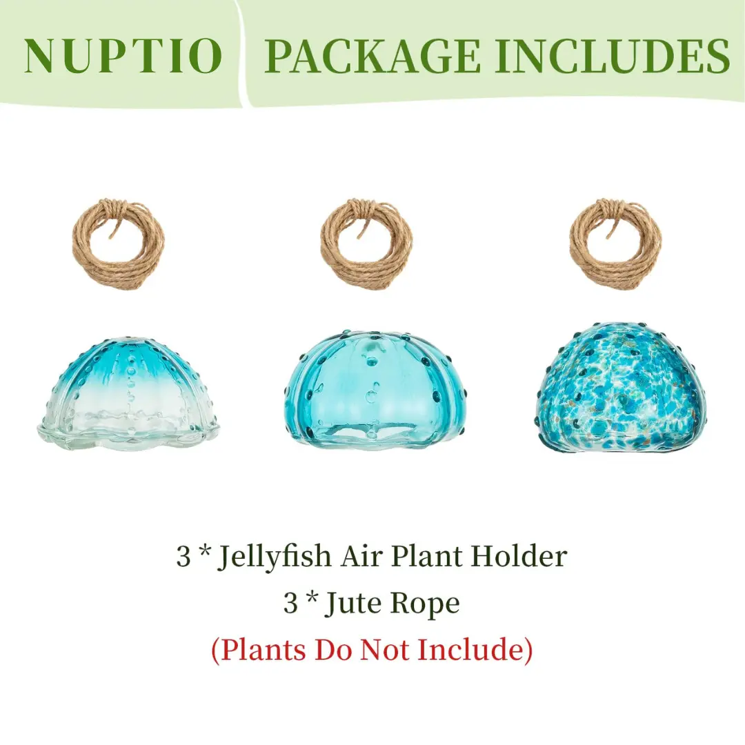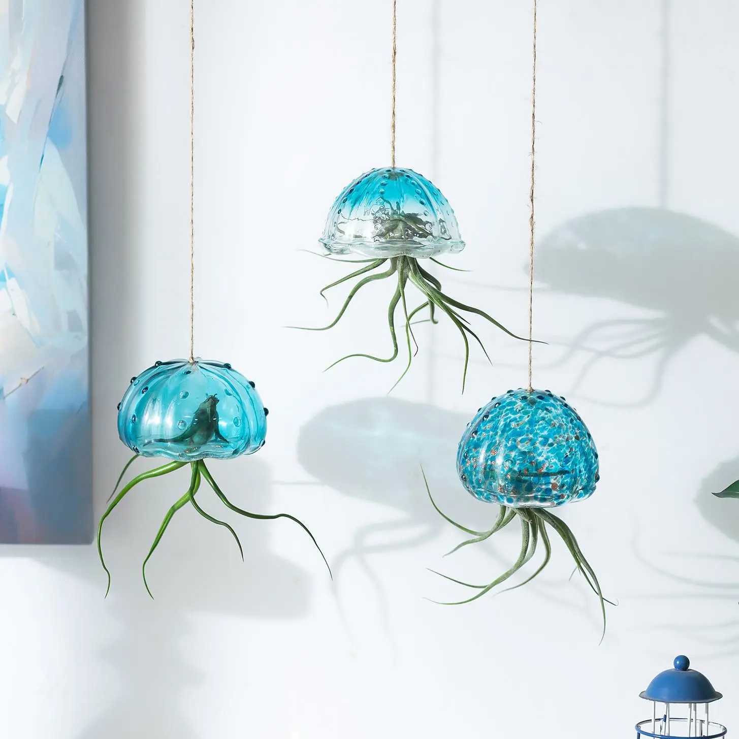 Three distinct jellyfish-designed air plant displayer, handcrafted by artisans using traditional glassblowing techniques. Each piece is carefully shaped with vibrant colors through manual pigment dipping and blown from robust soda-lime glass, ensuring enhanced thickness and long-lasting durability.