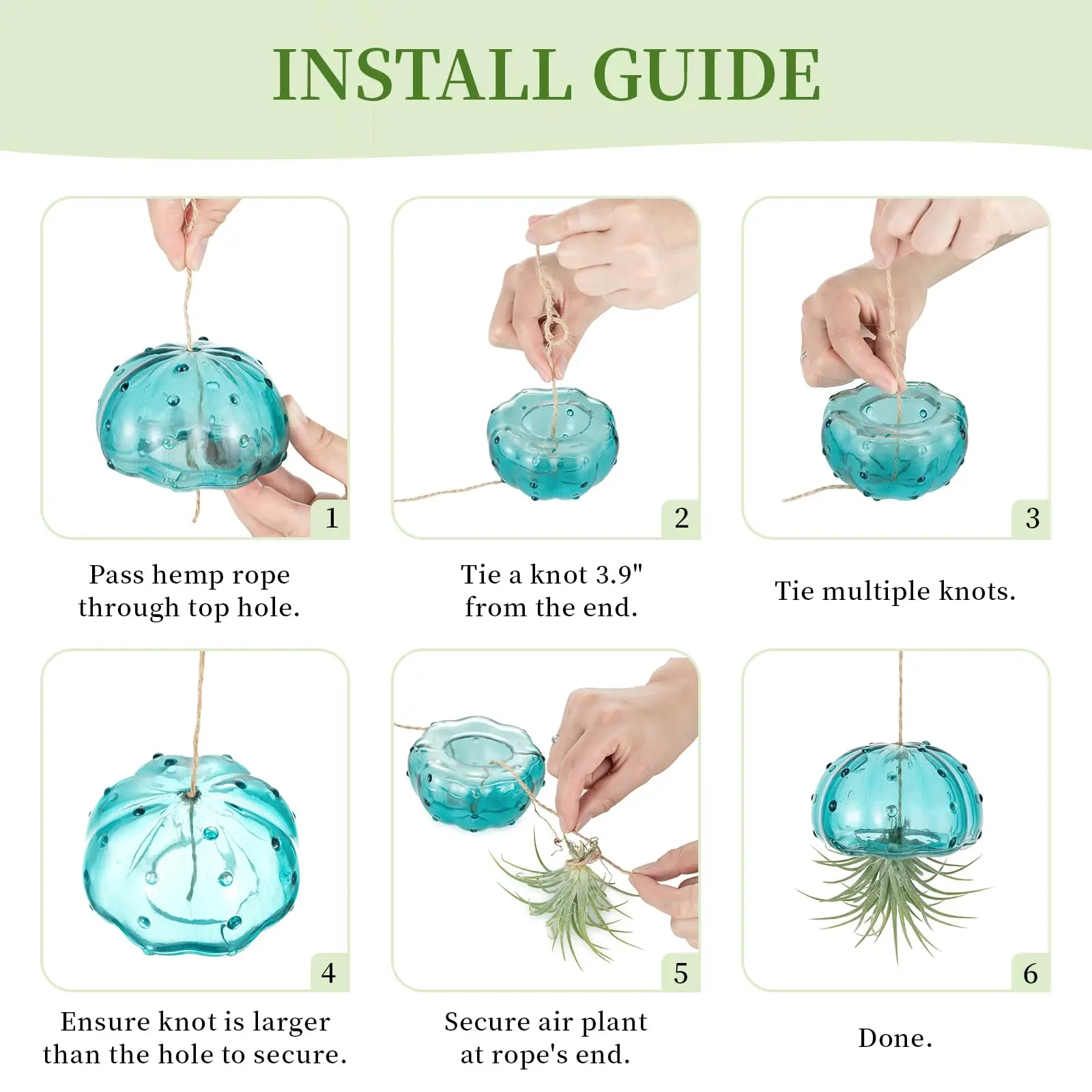 Installation can be completed in just three simple steps.: First, thread the rope through the top hole and tie a knot approximately 3.9 inches from the end to secure the holder (ensure the knot exceeds the hole size), then attach the air plant to the rope's bottom end, and finally hang the assembly in your location. Note: Listing picture provides detailed guidance.