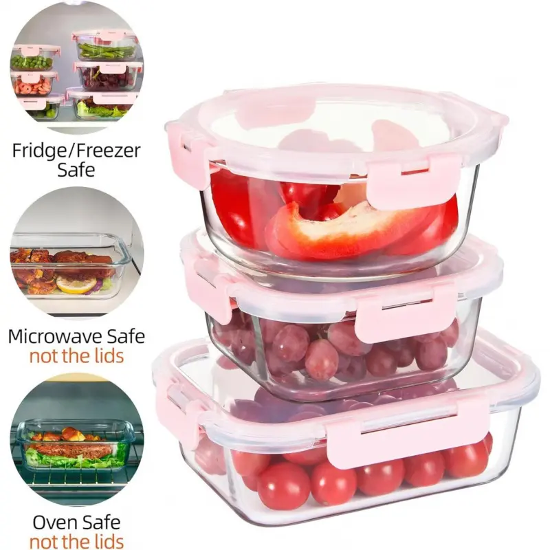 Glass storage containers are made of high borosilicate glass to ensure they can withstand temperature changes.They can be safely placed in the refrigerator or heated in the microwave (glass material only)