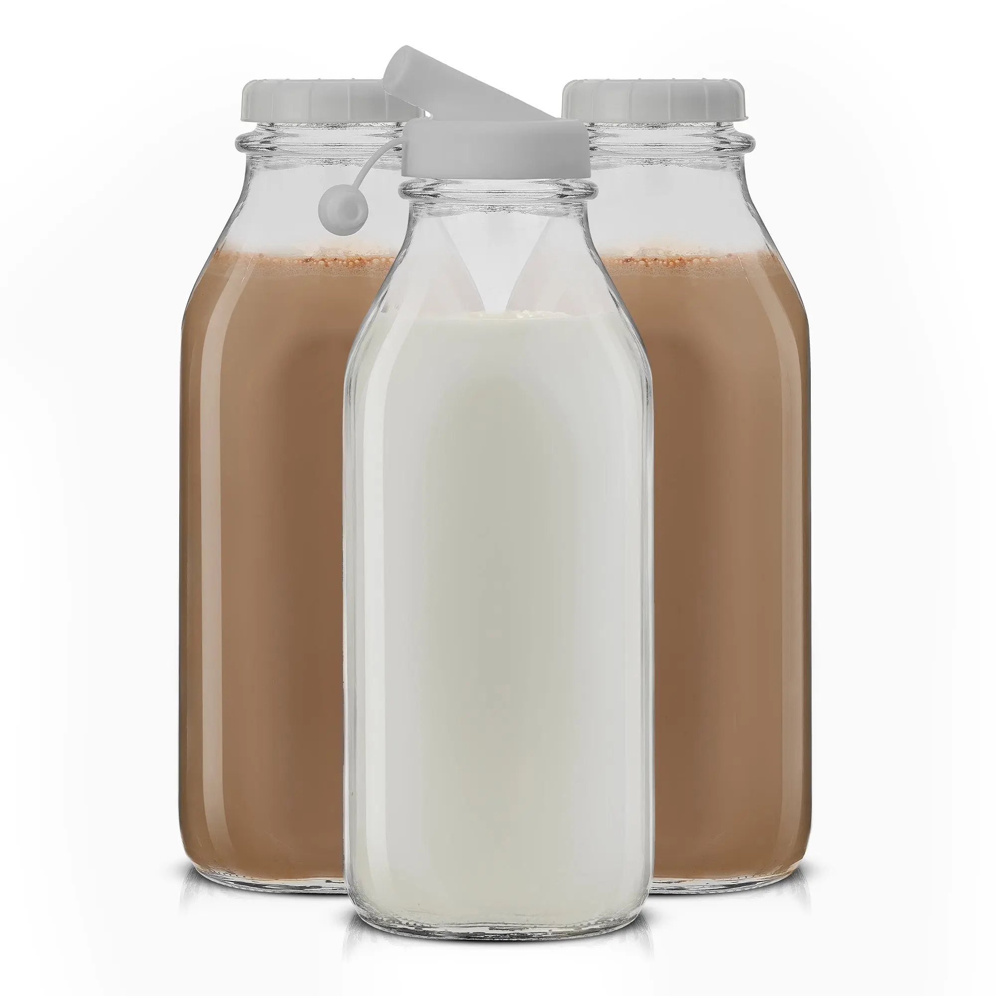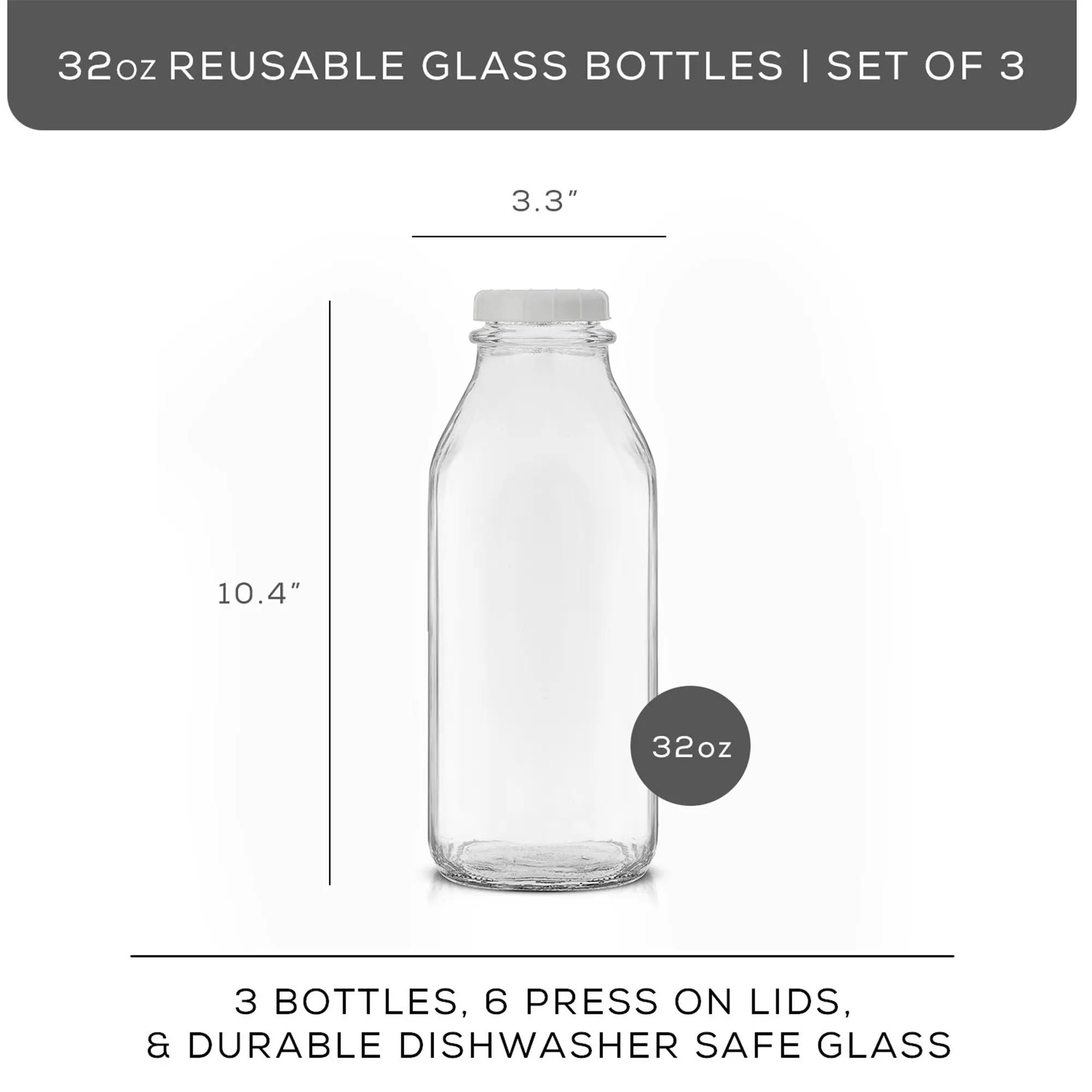 Upgrade your kitchen essentials with a touch of nostalgia! These milk bottles are a nostalgic nod to the past with a modern, reusable twist. Crafted from lead-free glass, these thick glass bottles hold a generous 32oz (or 64oz, if you're feeling extra thirsty) of your favorite beverage – from creamy nut milks to alkaline water to acidic orange or tomato juices. The leakproof caps and handy pourer keep things mess-free, while the classic design adds a touch of vintage charm to your kitchen. Style that brings back the good ol' days, one sip at a time!