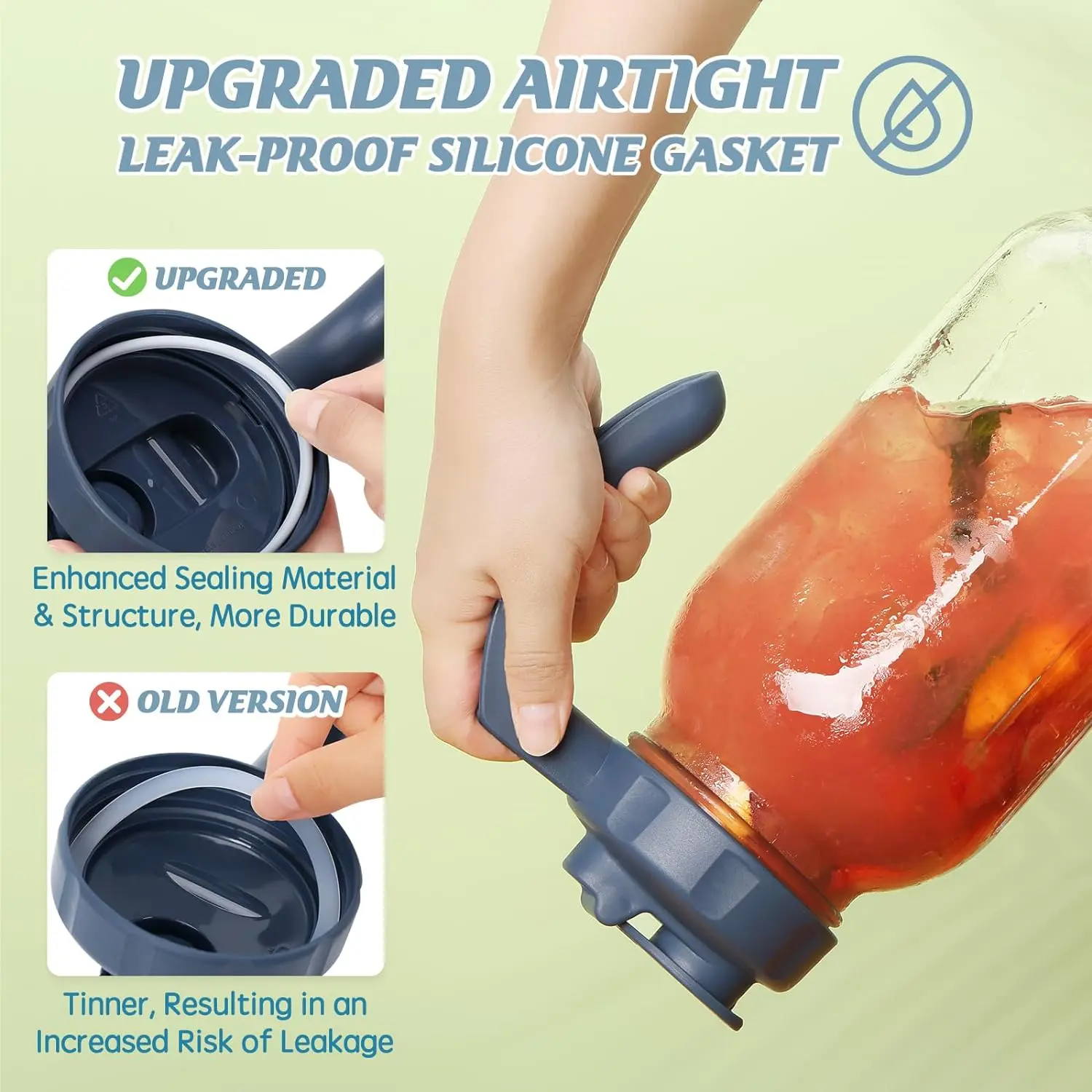 ·Airtight and Leak-proof - The mason jar pour spout lids, together with the gaskets and tightly secured caps, provide optimal sealing, keeping your food and liquids fresh and allowing you to easily pour the liquid of your mason jars with one hand.