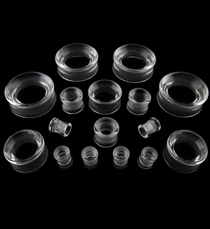 Clear glass tunnel plugs ranging in size from 2G - 4". Made from borosilicate glass. Double flares. Great option to have in your plug collection. Sold in pairs (2pcs).