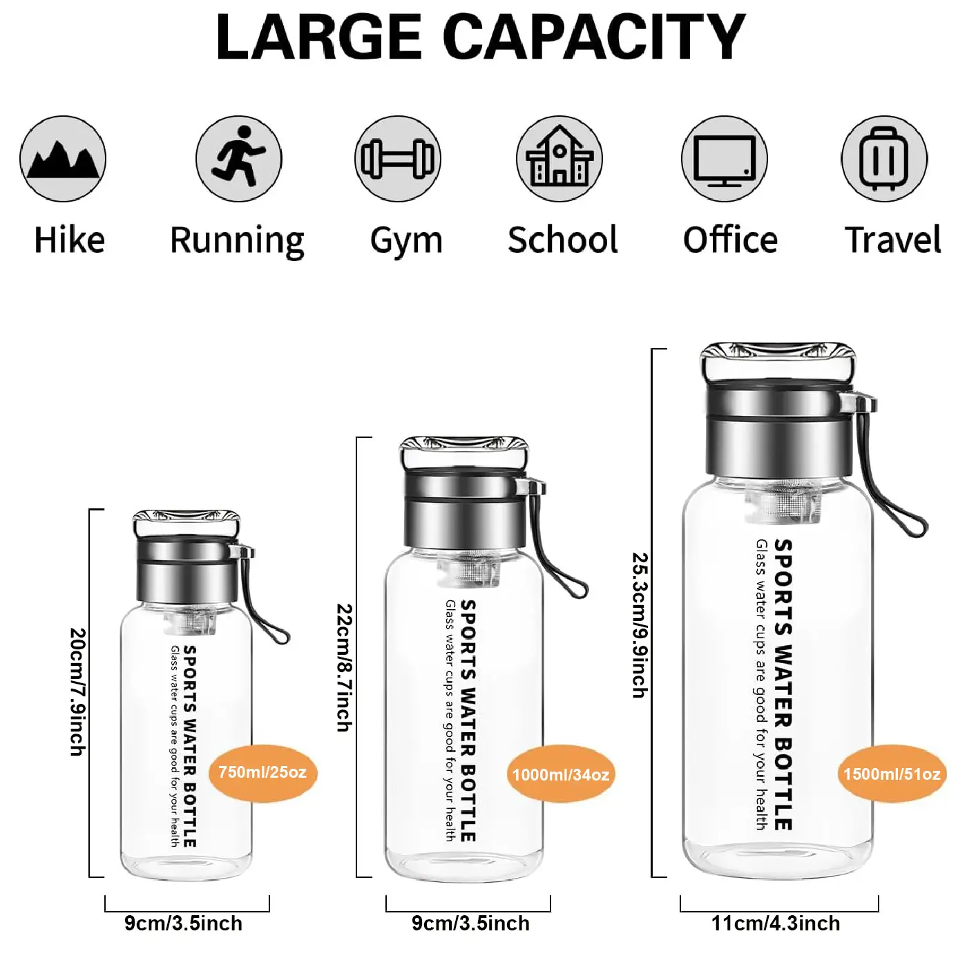 ·3. Size Does Matter: Whether you're hitting the gym, or office, or exploring the great outdoors, we've got you covered. Our water bottle glass is available in three sizes - 25oz, 34oz, 51oz, catering to your various hydration needs. More water, more life!