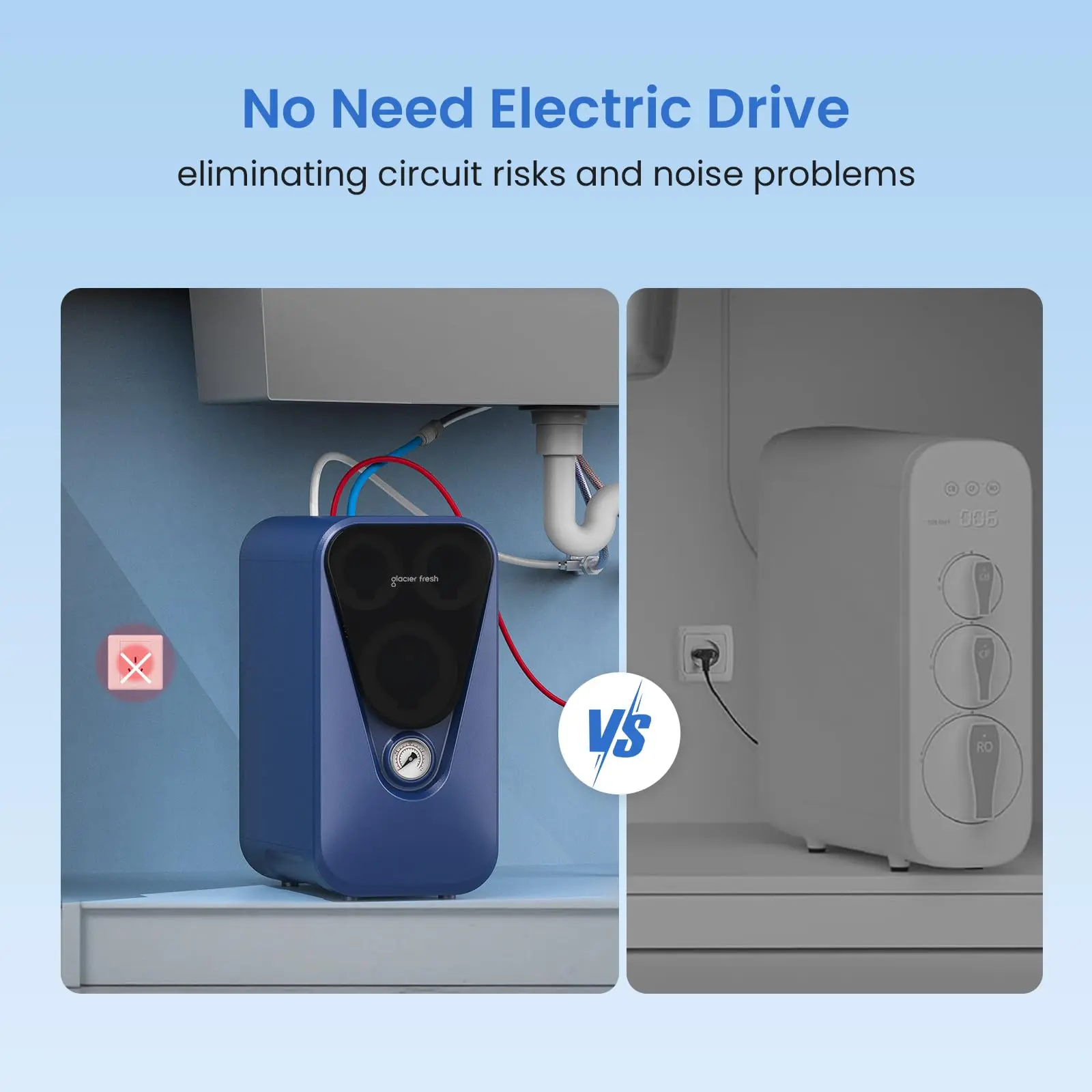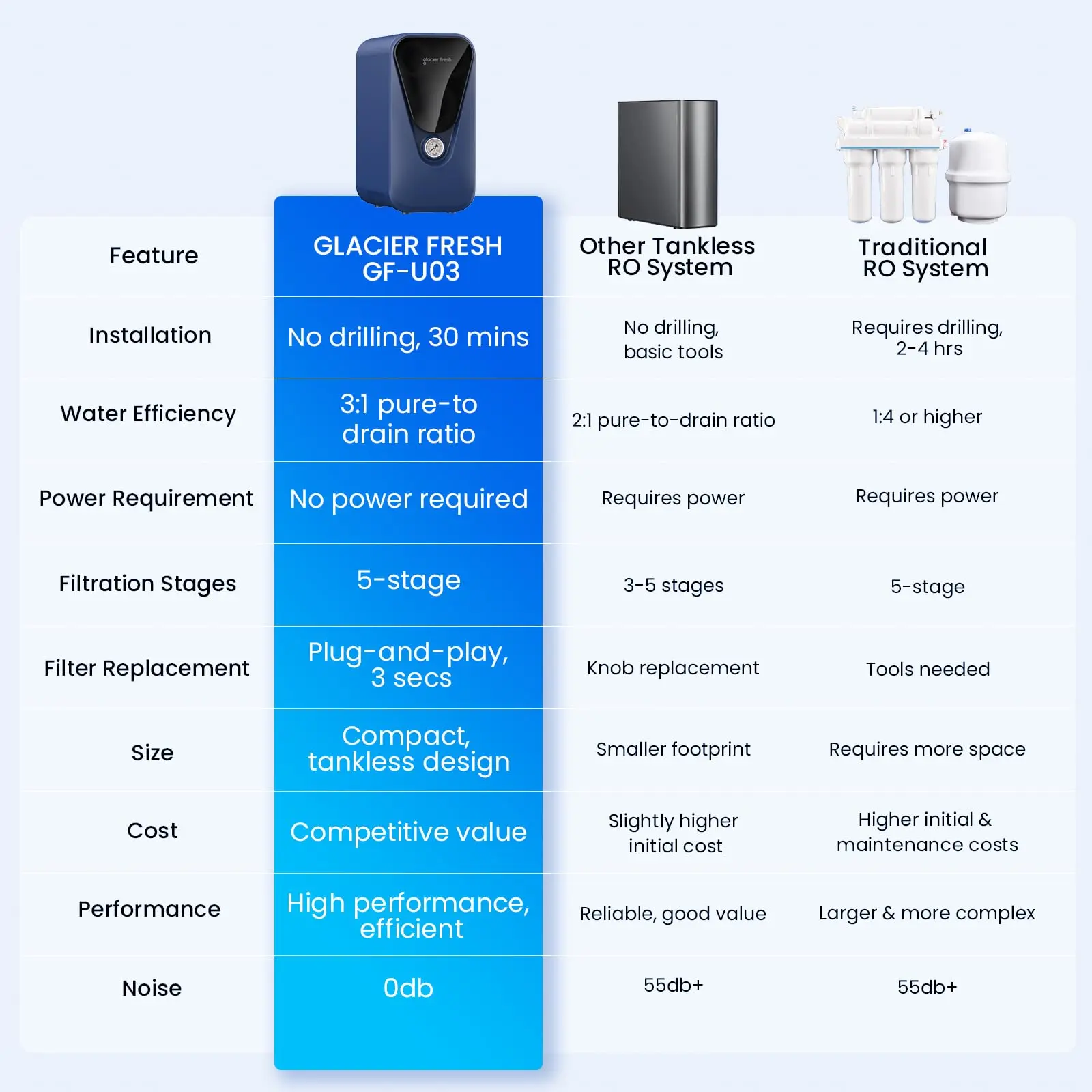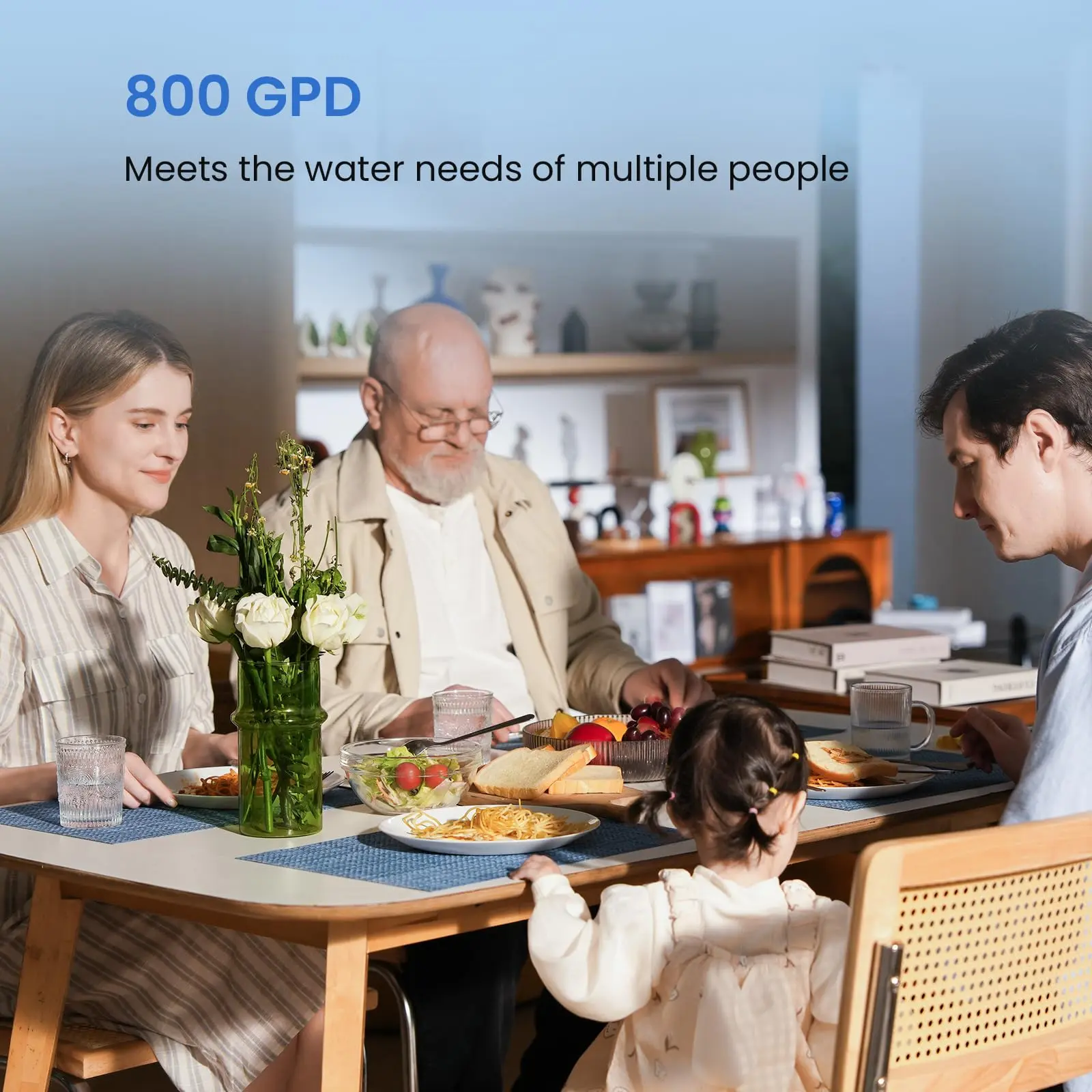 The tankless design saves up to 70% of under-sink space. Change the filter in less than 3 seconds without tools or system movement. It delivers 800 gallons per day, ideal for large families. Filters one cup in just 5 seconds, ensuring continuous supply.