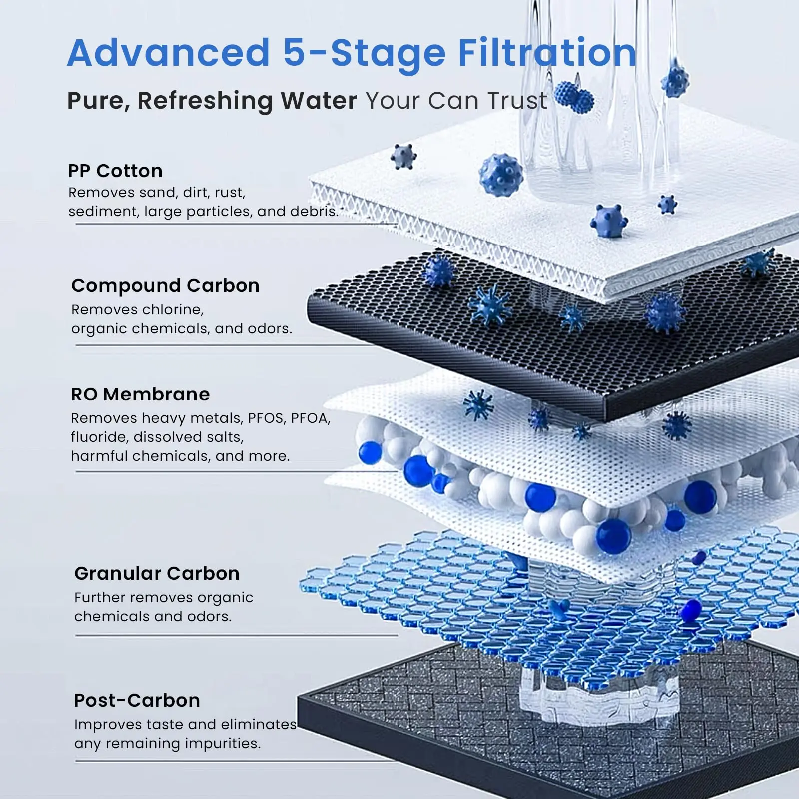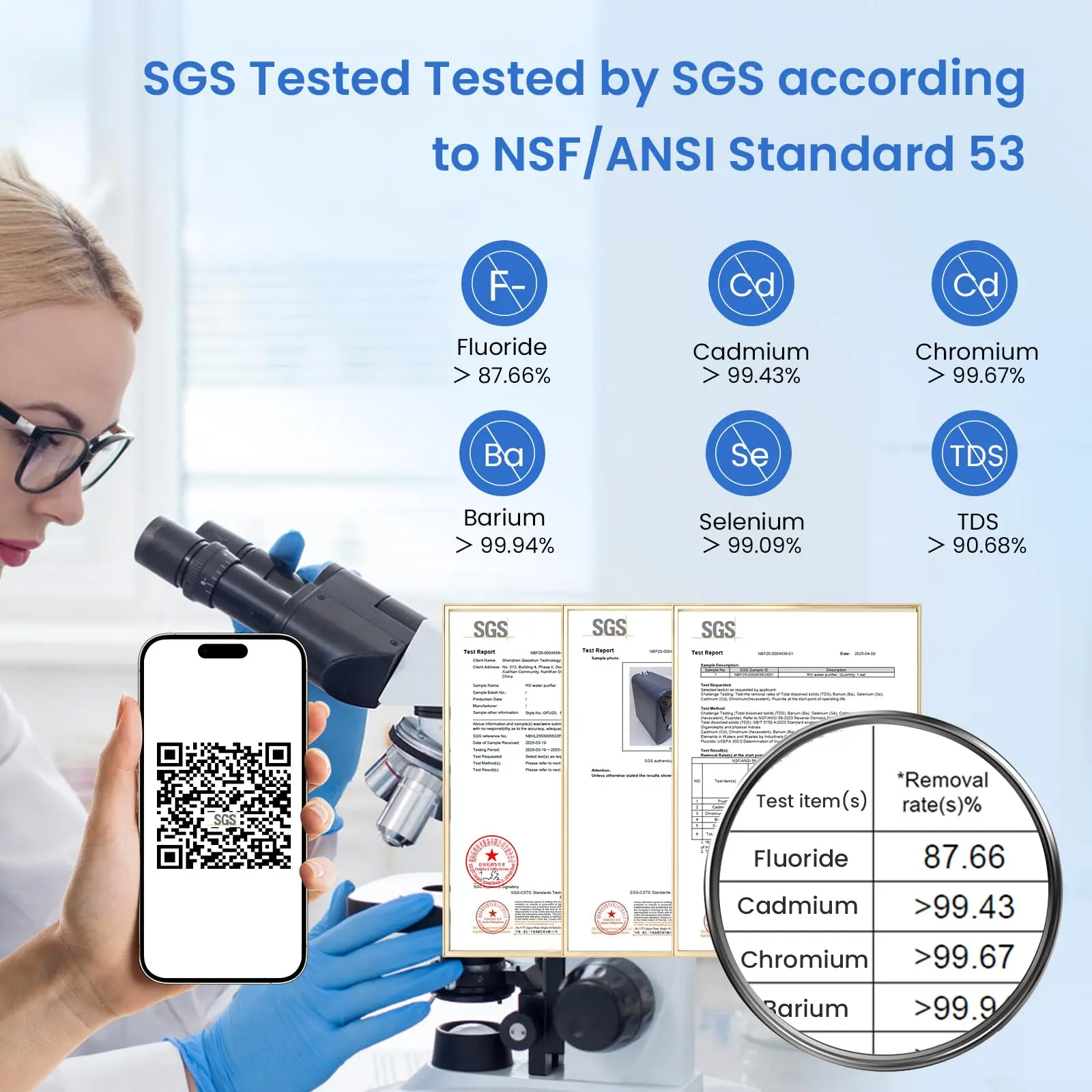 Meets NSF/ANSI 58 standards, reducing TDS, chromium, PFAS, radium, fluoride, arsenic, iron, calcium, particles, chloride, chlorine, and radioactive substances. Minimizes chemicals like vinyl chloride and ethylhexyl acrylate. Produces just one cup of wastewater for every three cups of filtered water, saving water.