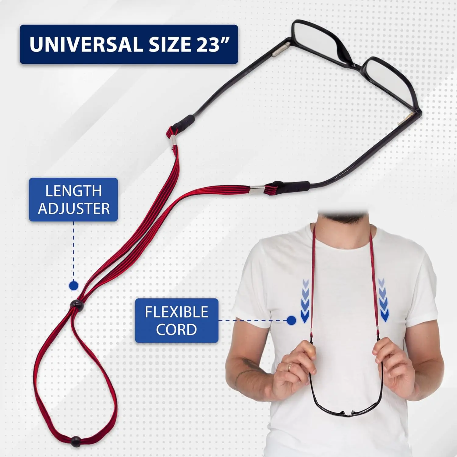 ·Comfortable Length Adjuster: The eyeglass holder strap measures 23" in length, including the tips. The eyeglass strap for men and women length is designed to allow you to comfortably wear your glasses around your chest and neck when not in use. The eye glasses holders around neck are easily adjustable, allowing you to effortlessly customize the fit for any head size