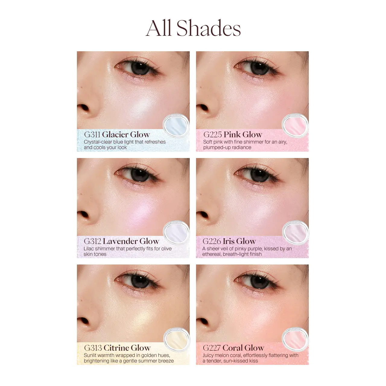 I bought this by advertisement. The lady showed glass look shiny no glitter powder blush highlighter. When I received it the only good thing was cute packaging. It arrived with crack and looked dry like pressed powder. The pigment doesn’t show and also it is dry and nothing like advertised.