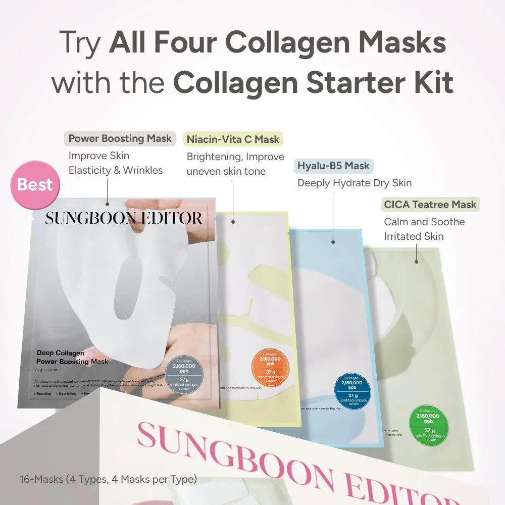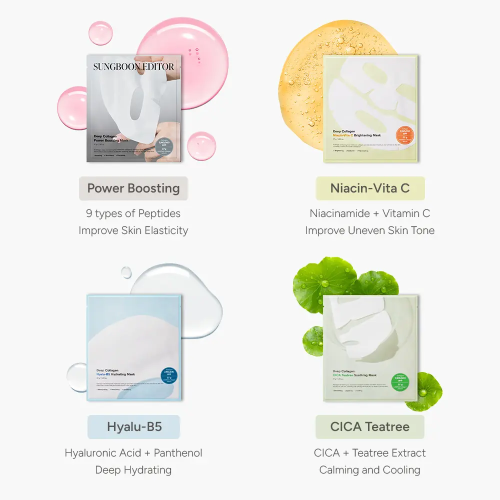 From hydration to brightening to calming care—this all-in-one set has your skin covered. Featuring 4 of SUNGBOON EDITOR's signature collagen sheet masks, each with a targeted formula to match your skin’s changing needs.