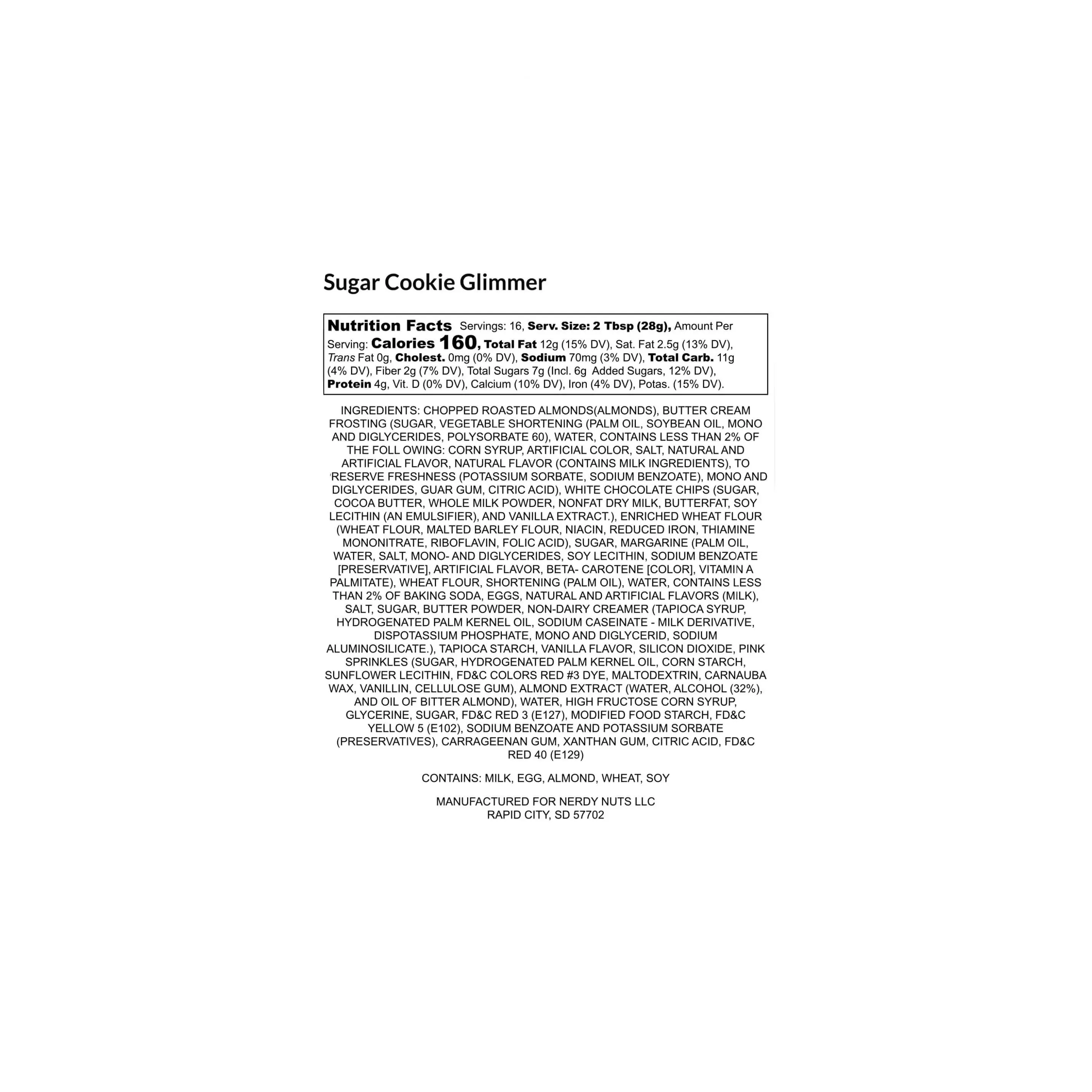 INGREDIENTS: CHOPPED ROASTED ALMONDS(ALMONDS), BUTTER CREAM FROSTING (SUGAR, VEGETABLE SHORTENING (PALM OIL, SOYBEAN OIL, MONO AND DIGLYCERIDES, POLYSORBATE 60), WATER, CONTAINS LESS THAN 2% OF THE FOLL OWING: CORN SYRUP, ARTIFICIAL COLOR, SALT, NATURAL AND ARTIFICIAL FLAVOR, NATURAL FLAVOR (CONTAINS MILK INGREDIENTS), TO PRESERVE FRESHNESS (POTASSIUM SORBATE, SODIUM BENZOATE), MONO AND DIGLYCERIDES, GUAR GUM, CITRIC ACID), WHITE CHOCOLATE CHIPS (SUGAR, COCOA BUTTER, WHOLE MILK POWDER, NONFAT DRY MILK, BUTTERFAT, SOY LECITHIN (AN EMULSIFIER), AND VANILLA EXTRACT.), ENRICHED WHEAT FLOUR (WHEAT FLOUR, MALTED BARLEY FLOUR, NIACIN, REDUCED IRON, THIAMINE MONONITRATE, RIBOFLAVIN, FOLIC ACID), SUGAR, MARGARINE (PALM OIL, WATER, SALT, MONO- AND DIGLYCERIDES, SOY LECITHIN, SODIUM BENZOATE [PRESERVATIVE], ARTIFICIAL FLAVOR, BETA- CAROTENE [COLOR], VITAMIN A PALMITATE), WHEAT FLOUR, SHORTENING (PALM OIL), WATER, CONTAINS LESS THAN 2% OF BAKING SODA, EGGS, NATURAL AND ARTIFICIAL FLAVORS (MILK), SALT, SUGAR, BUTTER POWDER, NON-DAIRY CREAMER (TAPIOCA SYRUP, HYDROGENATED PALM KERNEL OIL, SODIUM CASEINATE - MILK DERIVATIVE, DISPOTASSIUM PHOSPHATE, MONO AND DIGLYCERID, SODIUM ALUMINOSILICATE.), TAPIOCA STARCH, VANILLA FLAVOR, SILICON DIOXIDE, PINK SPRINKLES (SUGAR, HYDROGENATED PALM KERNEL OIL, CORN STARCH, SUNFLOWER LECITHIN, FD&C COLORS RED #3 DYE, MALTODEXTRIN, CARNAUBA WAX, VANILLIN, CELLULOSE GUM), ALMOND EXTRACT (WATER, ALCOHOL (32%), AND OIL OF BITTER ALMOND), WATER, HIGH FRUCTOSE CORN SYRUP, GLYCERINE, SUGAR, FD&C RED 3 (E127), MODIFIED FOOD STARCH, FD&C YELLOW 5 (E102), SODIUM BENZOATE AND POTASSIUM SORBATE (PRESERVATIVES), CARRAGEENAN GUM, XANTHAN GUM, CITRIC ACID, FD&C RED 40 (E129)