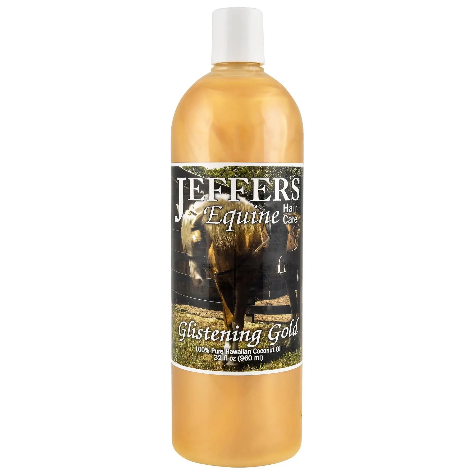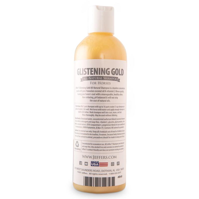 Jeffers Glistening Gold Horse Shampoo is a gentle, all-natural concentrate enriched with Hawaiian coconut oil and vitamin E. Formulated for equine comfort and performance, this tearless, pH balanced shampoo cleans without stripping the coat of essential oils. Ideal for horses with sensitive skin, it delivers a healthy shine while leaving the coat soft, manageable, and moisturized. Its eco-conscious and detergent-free formula makes it perfect for routine grooming and show preparation.