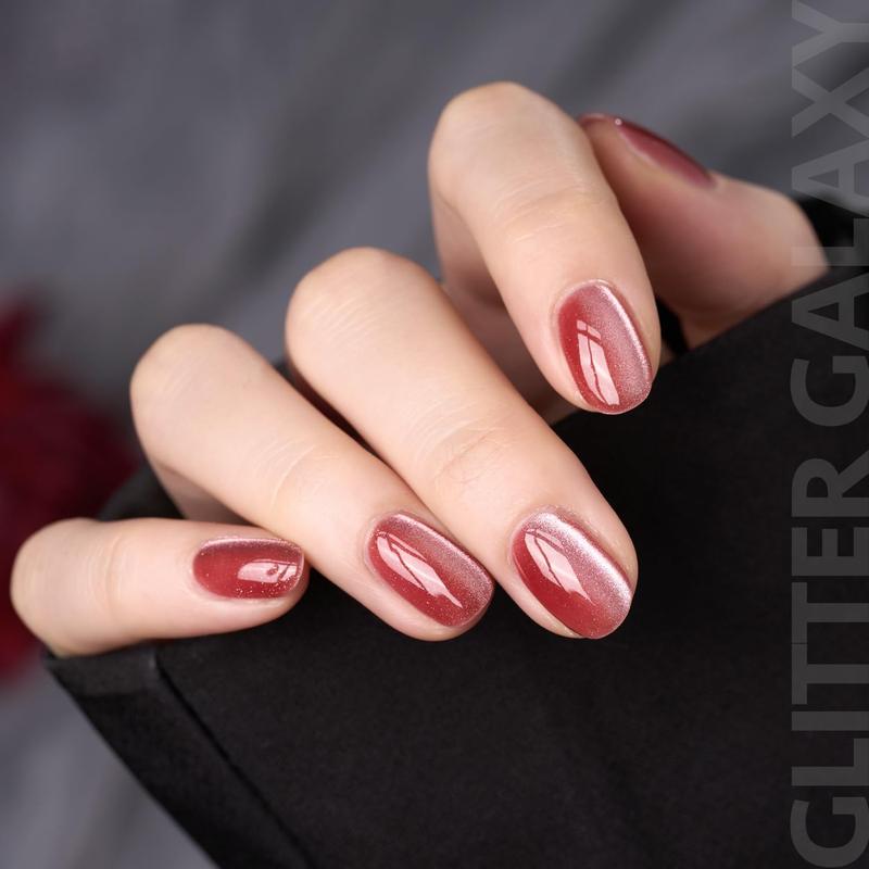 Glitter Cat Eye: Use the magnet to create desired pattern before curing. Apply gel top coat for gorgeous shimmery and sparkly finish. Heat up in winter to reduce thickness.