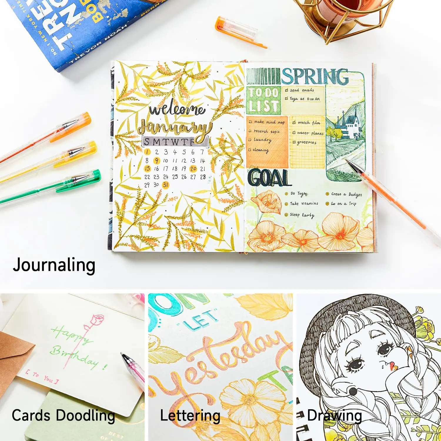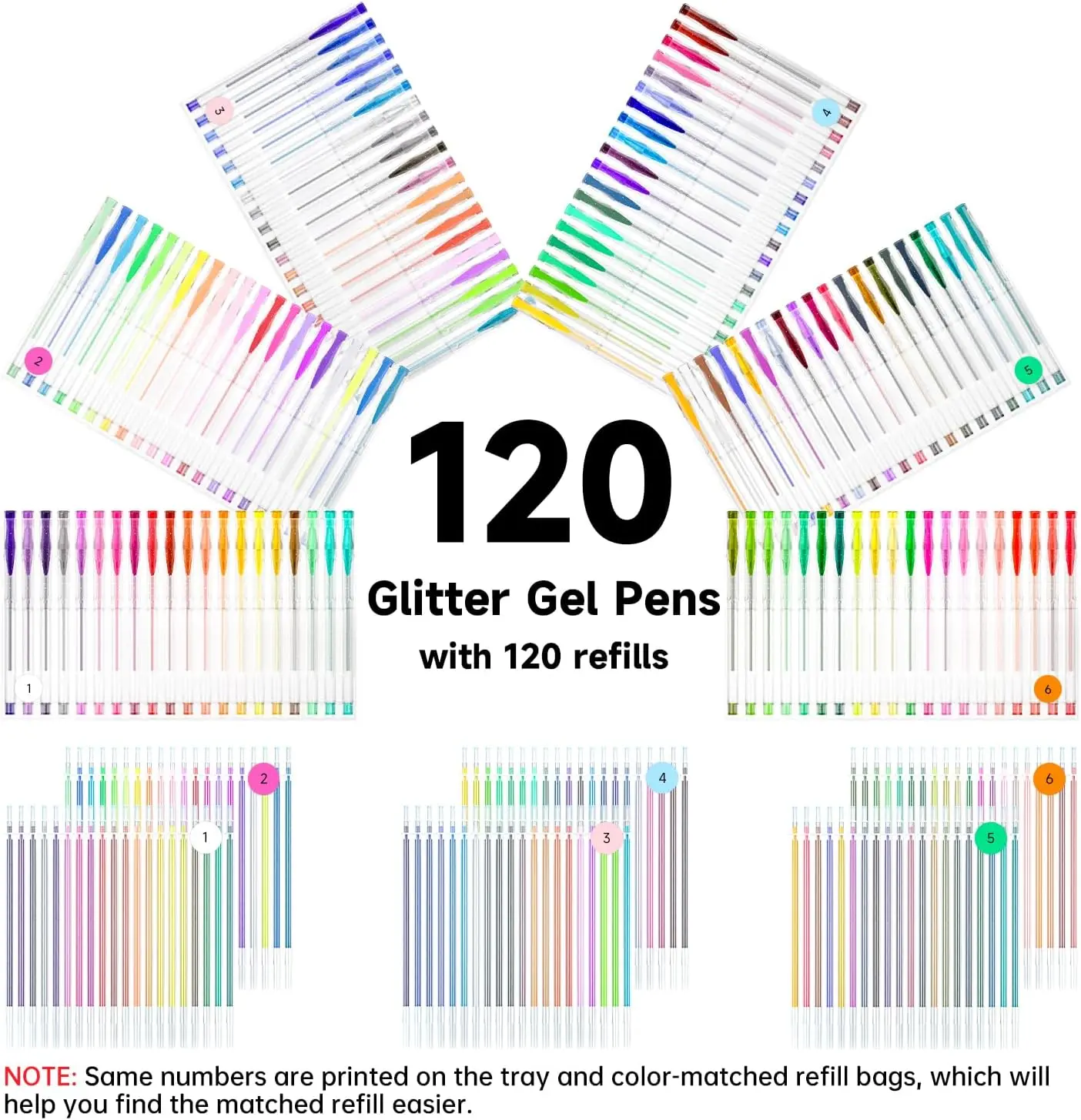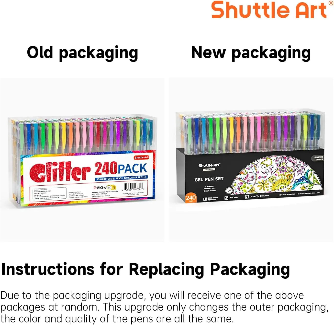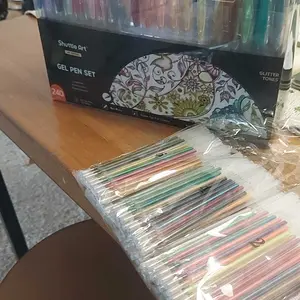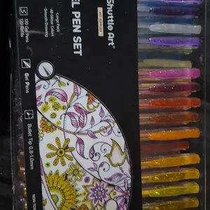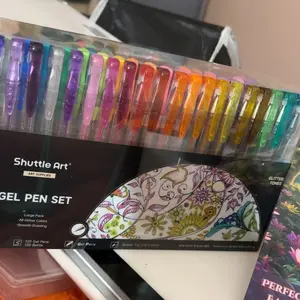 I am so disappointed in the colors they are hard to get started unlike Garbie Glitter Gel Pens. The last picture is from my Garbie Gel Pens the other pictures are from Shuttle Art pens. Totally unhappy with the product.