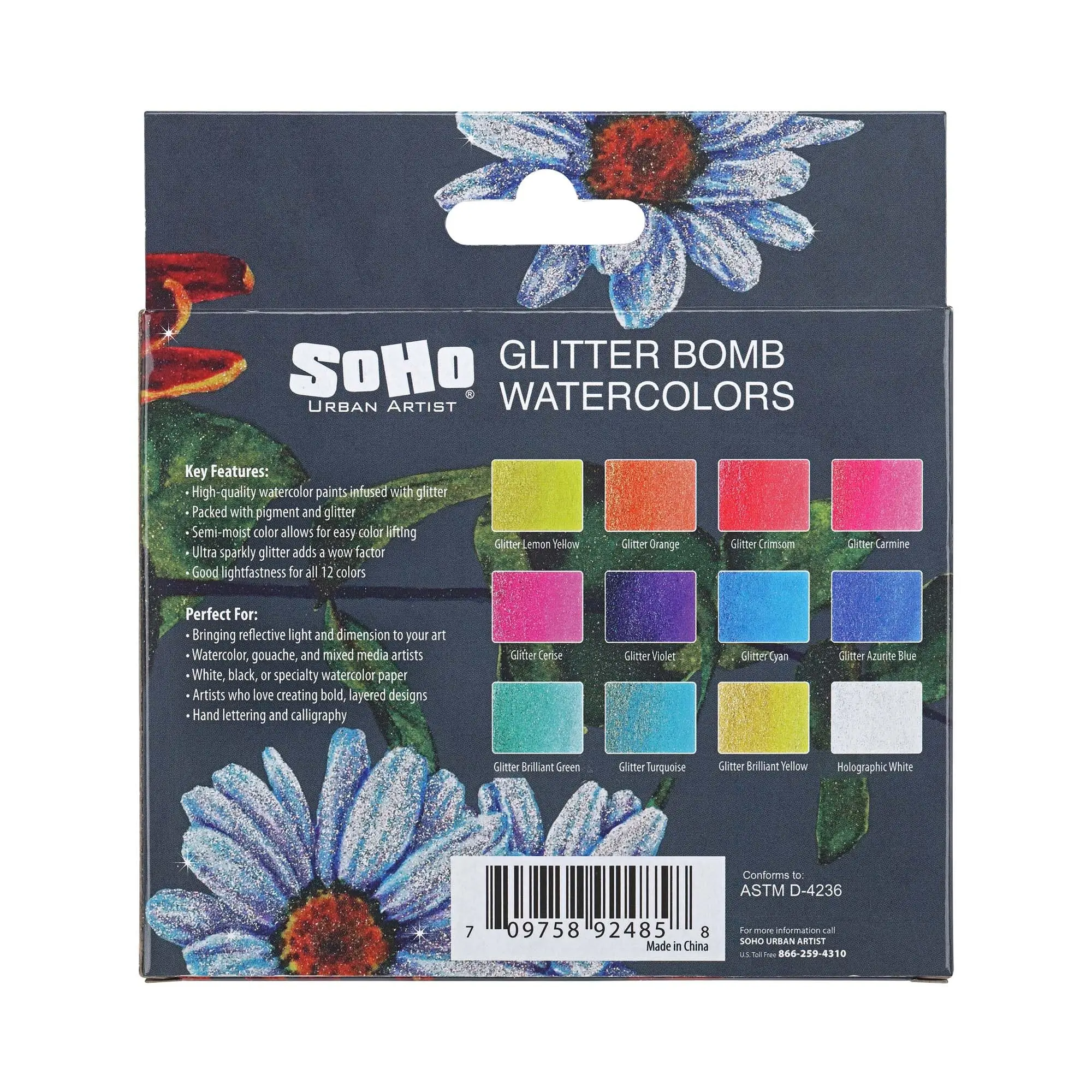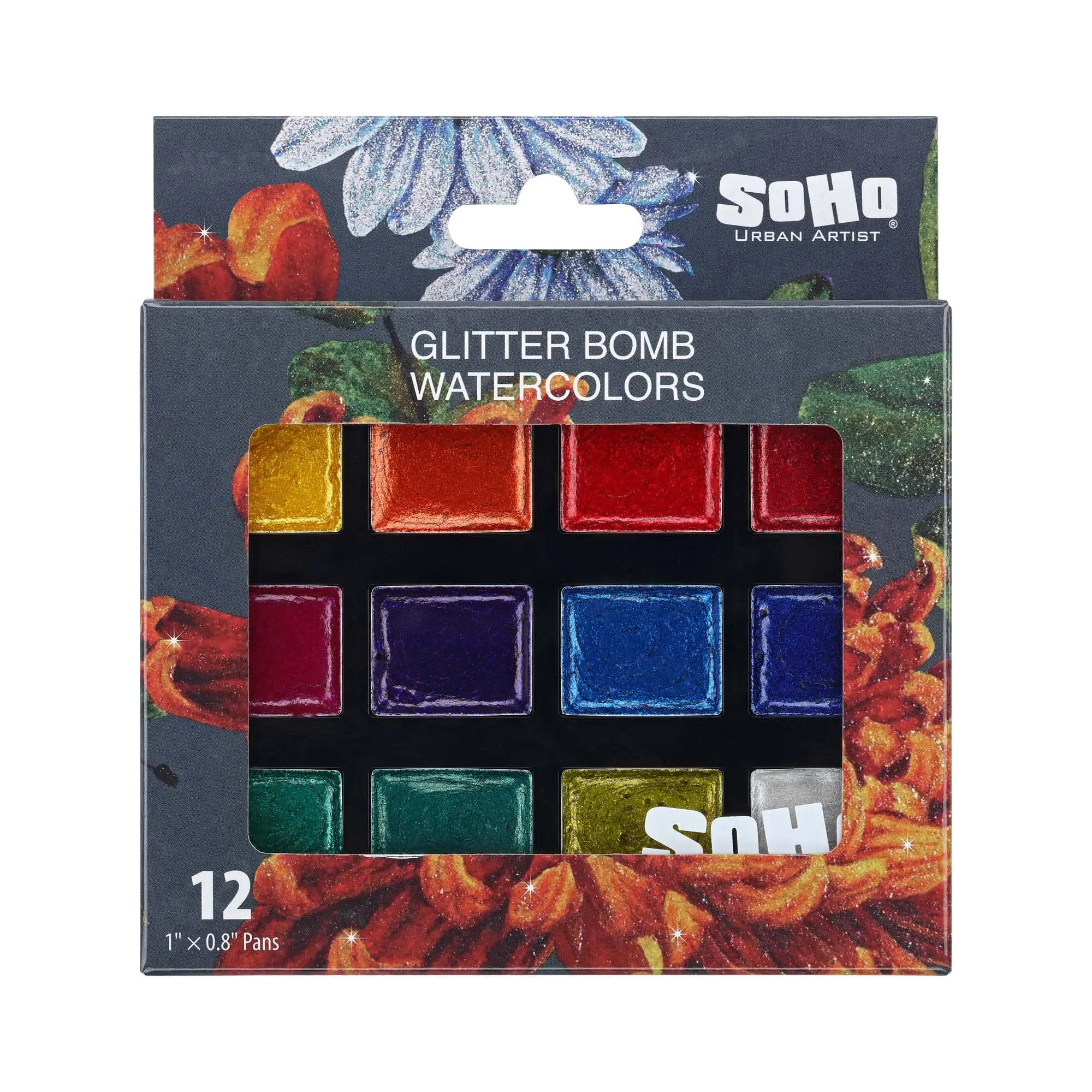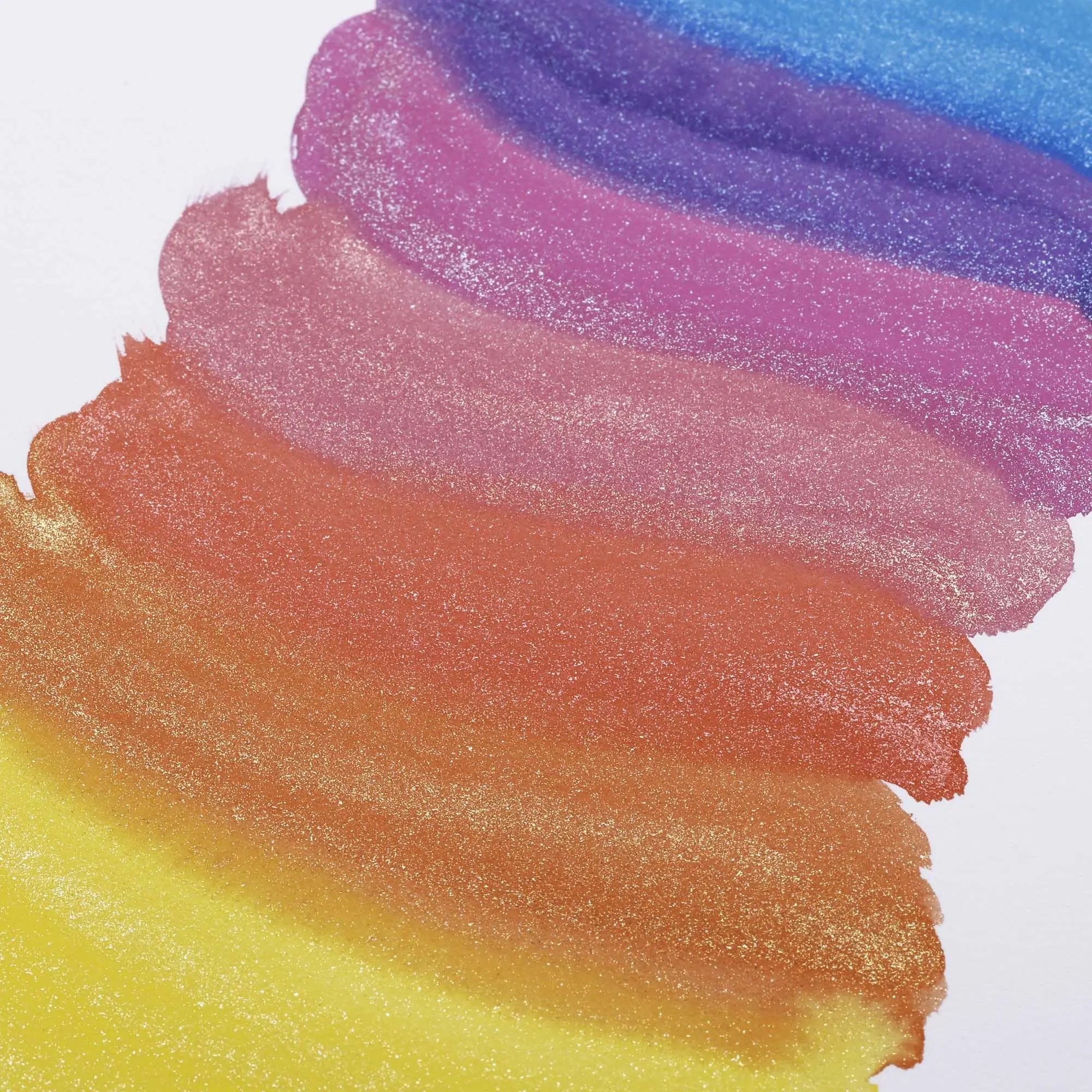 🎨 Vibrant Color Palette: Discover 12 ultra-sparkly semi-moist colors: Glitter Lemon, Glitter Brilliant Yellow, Glitter Orange, Glitter Crimson, Glitter Carmine, Glitter Cerise, Glitter Violet, Glitter Brilliant Green, Glitter Turquoise, Glitter Azurite Blue, Glitter Cyan, and Holographic White.