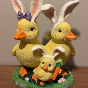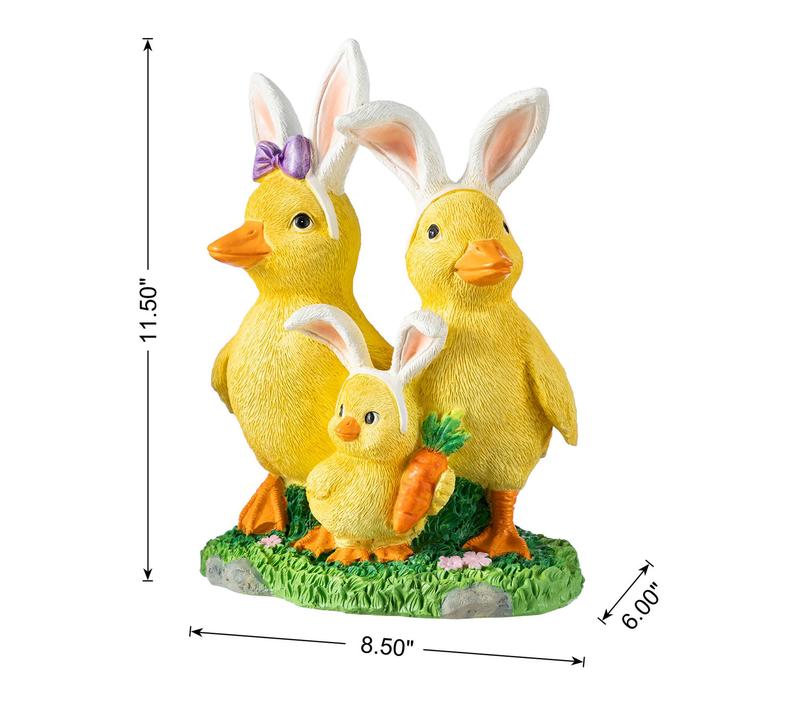 Bring a dash of whimsy to your Easter celebrations with this charming resin duck family table decor. Featuring three cheerful yellow ducks in bunny ears -- one clutching a carrot -- nestled on a grassy base dotted with tiny flowers, it creates a delightful springtime scene on mantels, countertops, or festive tables. From Glitzhome.