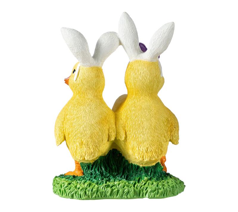 ·Features a trio of yellow ducks with bunny ears on a grassy, flower-dotted base