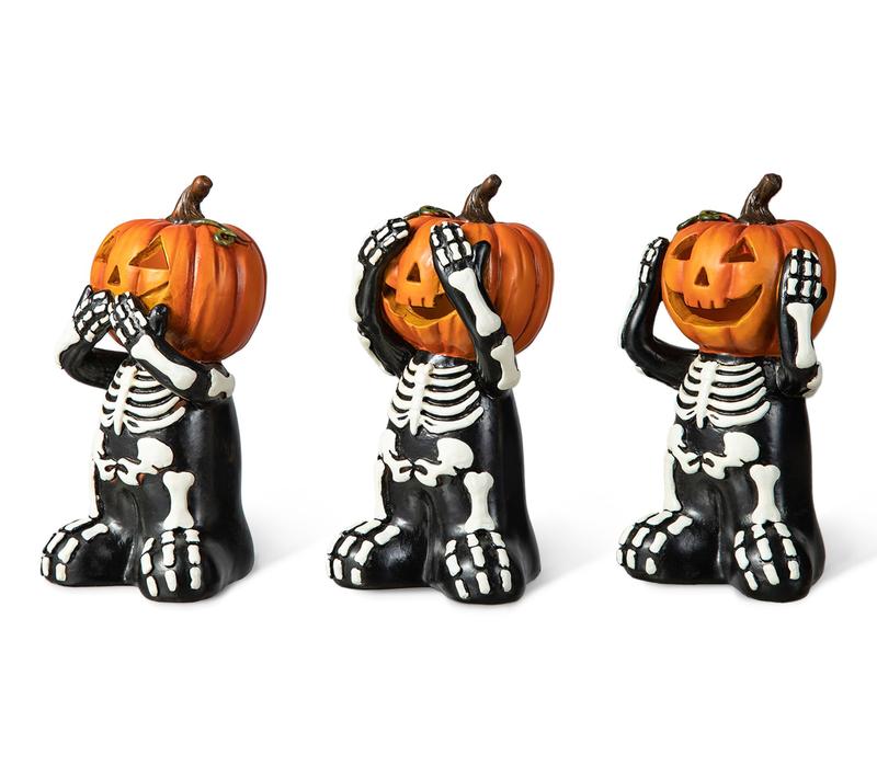 A set of three Halloween skeleton pumpkinheads that light up what else can we ask for in our Halloween decor here no evil no evil no evil pumpkins.  #skeleton #pumpkinheads #halloweendecor #spookyseason #qvc @QVC, Inc