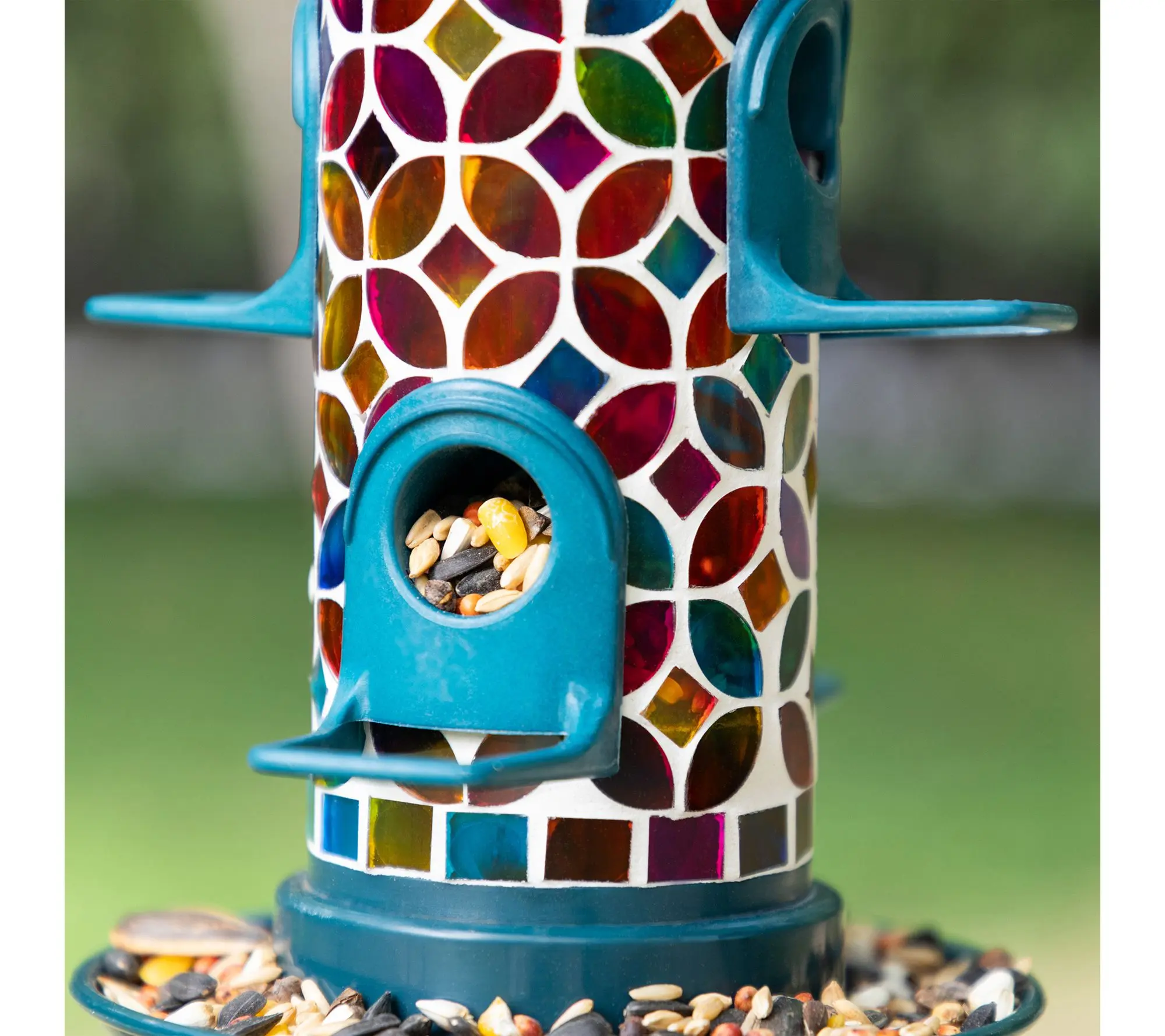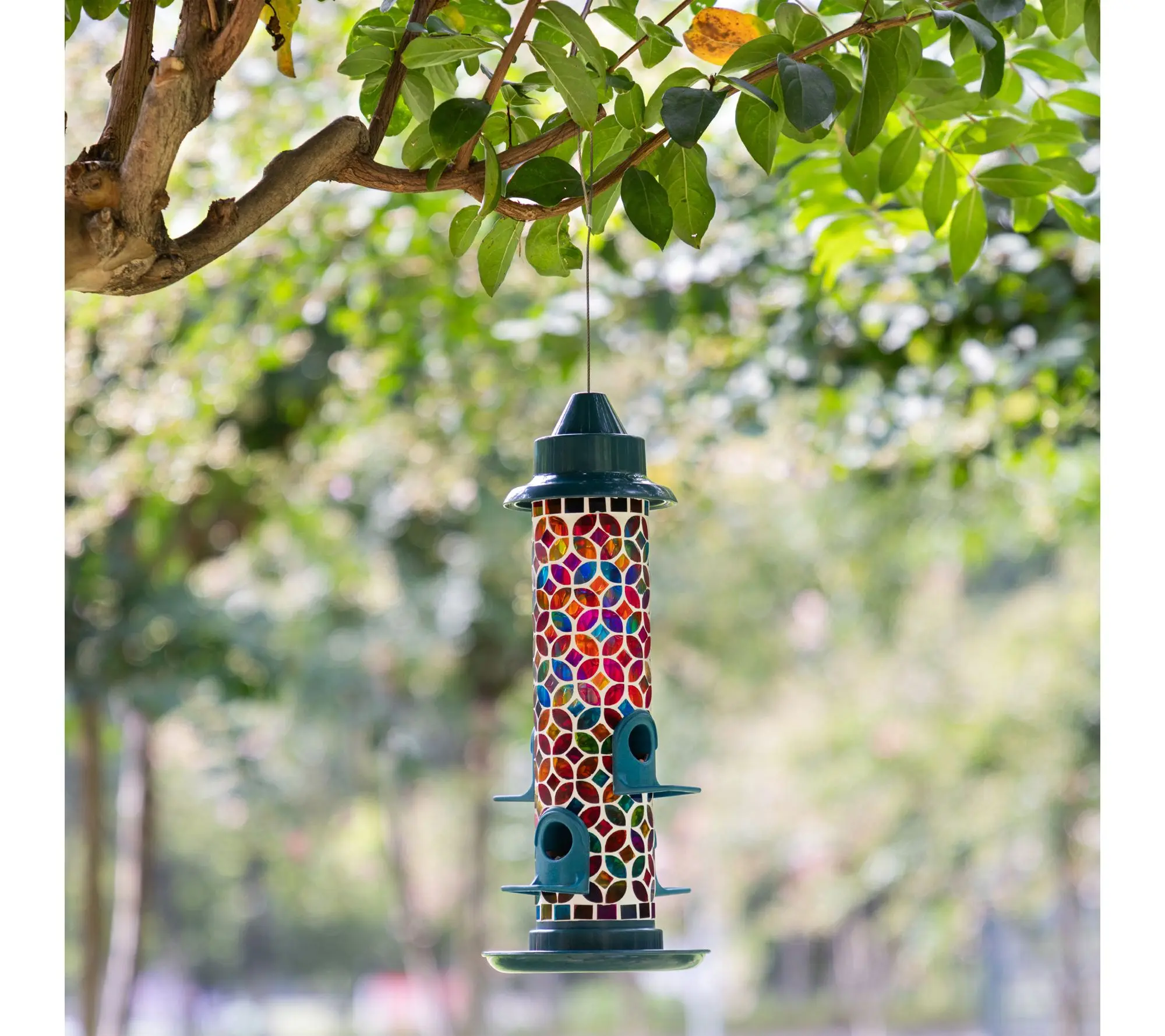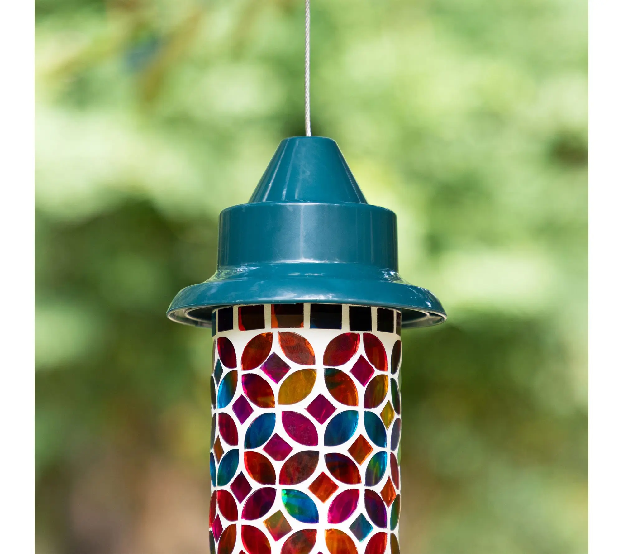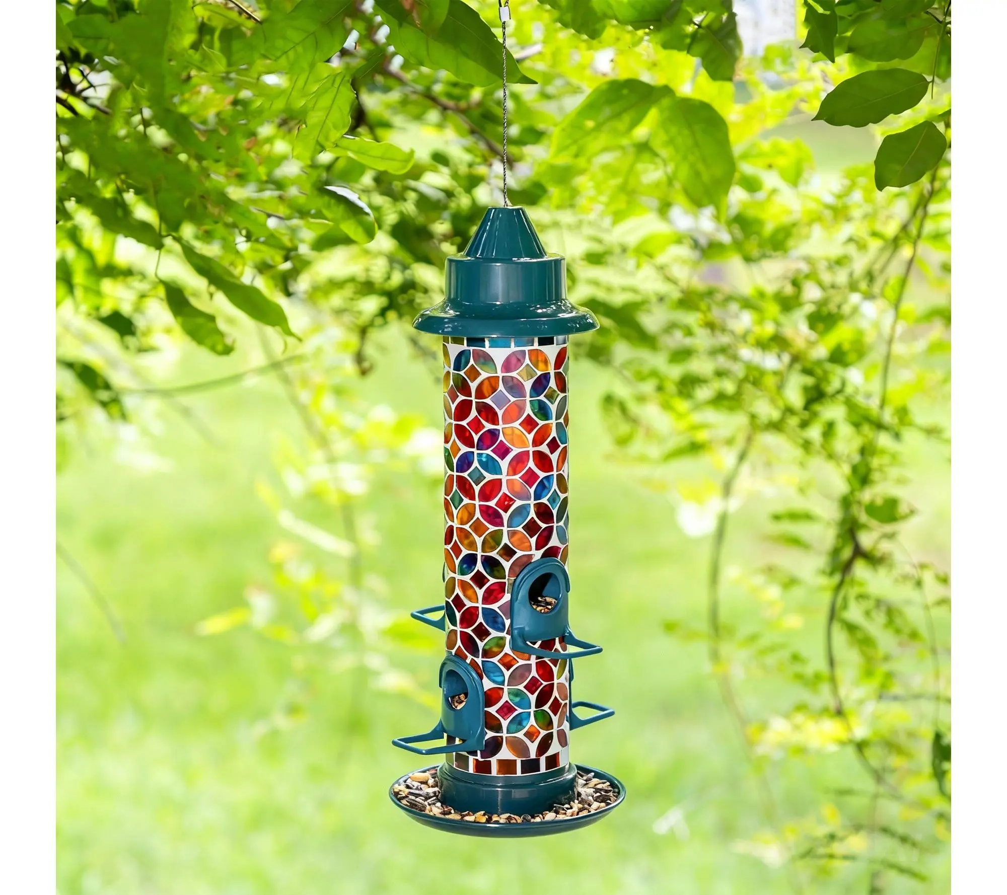 Brighten up your garden, patio, or backyard while inviting feathered friends to visit with this glass birdfeeder, featuring an eye-catching mosaic design bursting with vibrant color. The handcrafted details add a touch of artistry, while the metal hanger makes it easy to display in your favorite outdoor space and create a welcoming retreat. From Glitzhome.