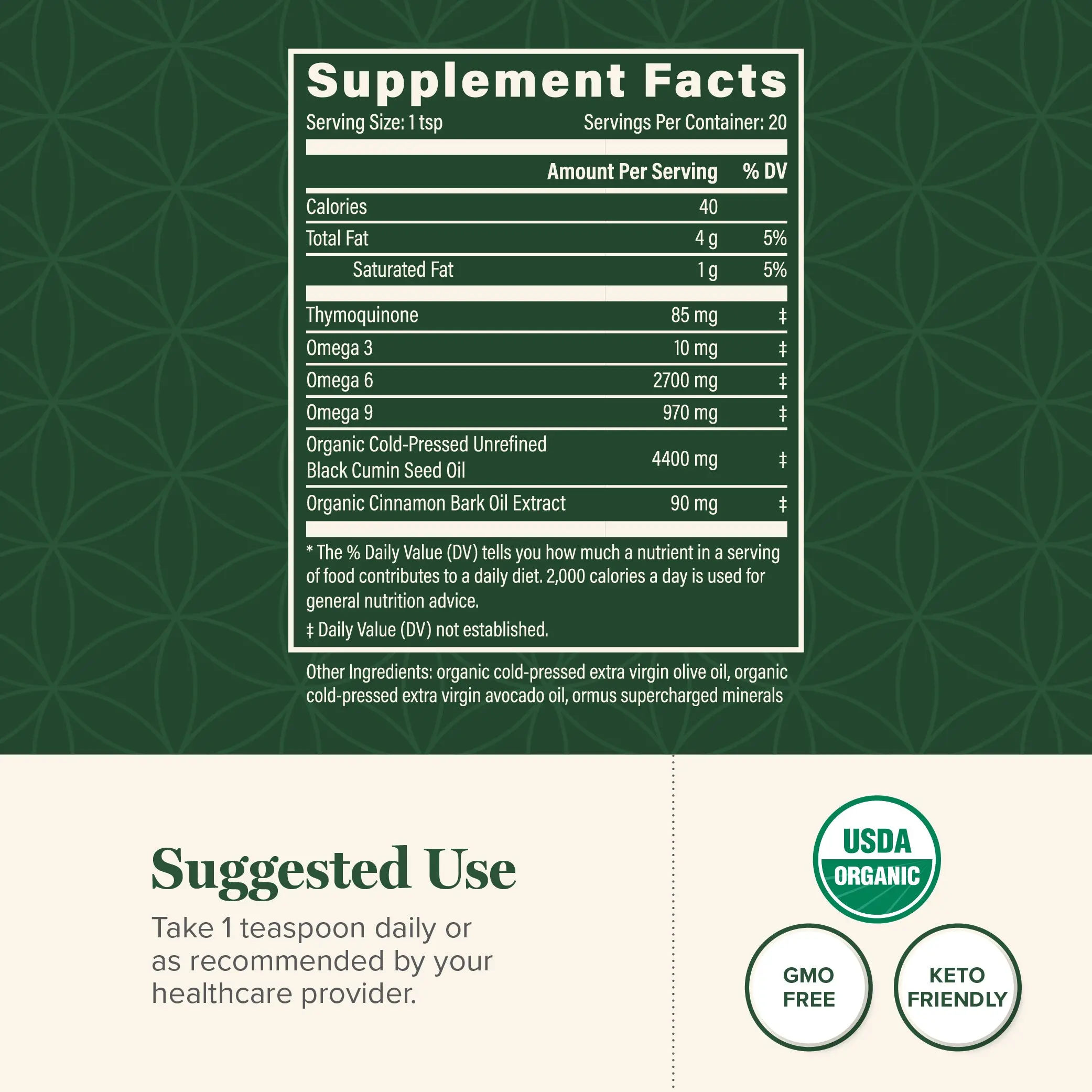 IngredientsOrganic Cold-Pressed Unrefined Black Cumin Seed Oil,Omega 6,Omega 9,Omega 3,Bark Oil Extract,Thymoquinone