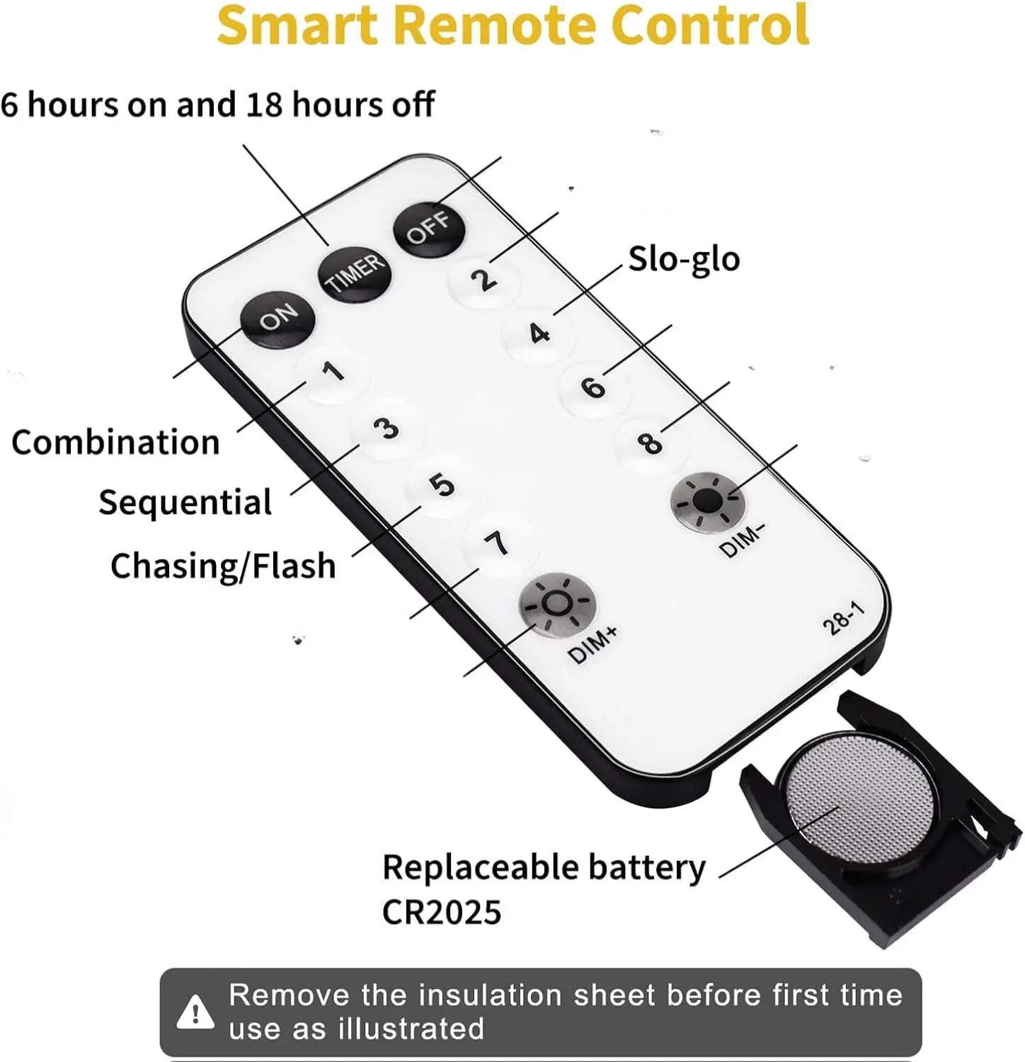 Enjoy 8 lighting modes: combination, in waves, sequential, slo-glo, chasing, flash, slow fade, twinkle, and steady on. The remote features a memory function. Set the timer for 6 hours on and 18 hours off daily. Ideal for special occasions like weddings and birthdays.