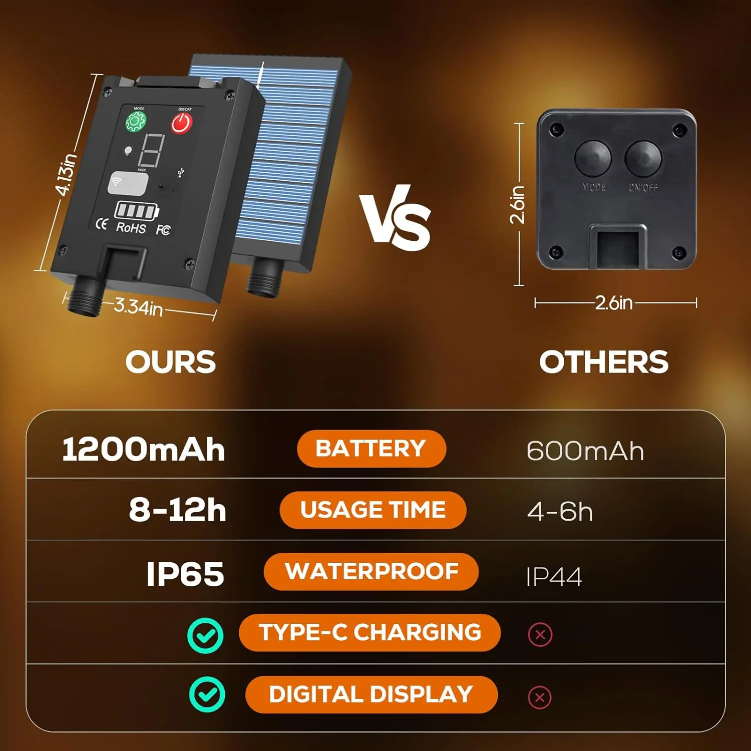 【Upgraded Solar Panel & Large Capacity】1200mah large capacity solar panel, lights up for all night (10-12 hours) after fully charged; Upgraded 2 functions: with extra USB C port (suitable for 5v adapter ), more convenient to outdoor use; modes and power display; more convenient and easy to use, suitable for all people