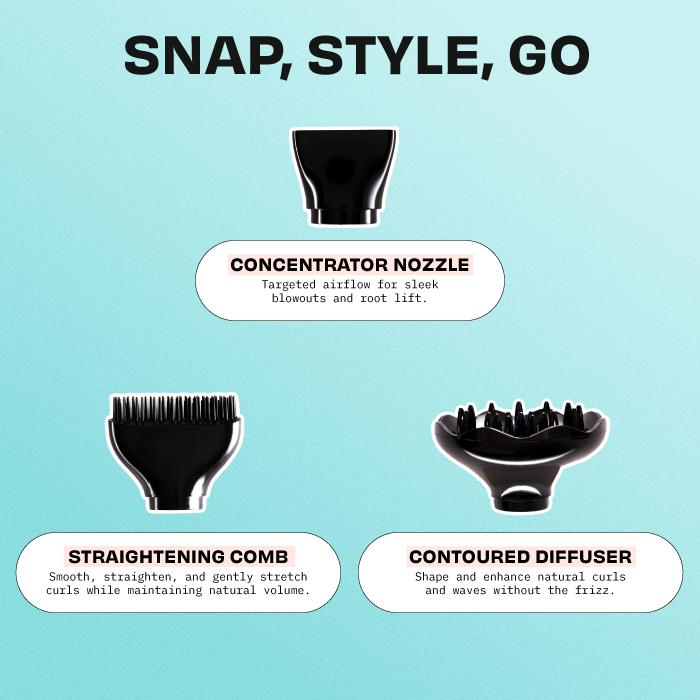 Powered by a 1400W brushless motor and advanced ionic technology, Globetrotter dries hair fast, reduces frizz, boosts shine, and leaves your strands smooth and sleek. With all-digital controls and three magnetic attachments (concentrator, straightening comb, diffuser), you can switch from a polished blowout to defined curls in seconds.