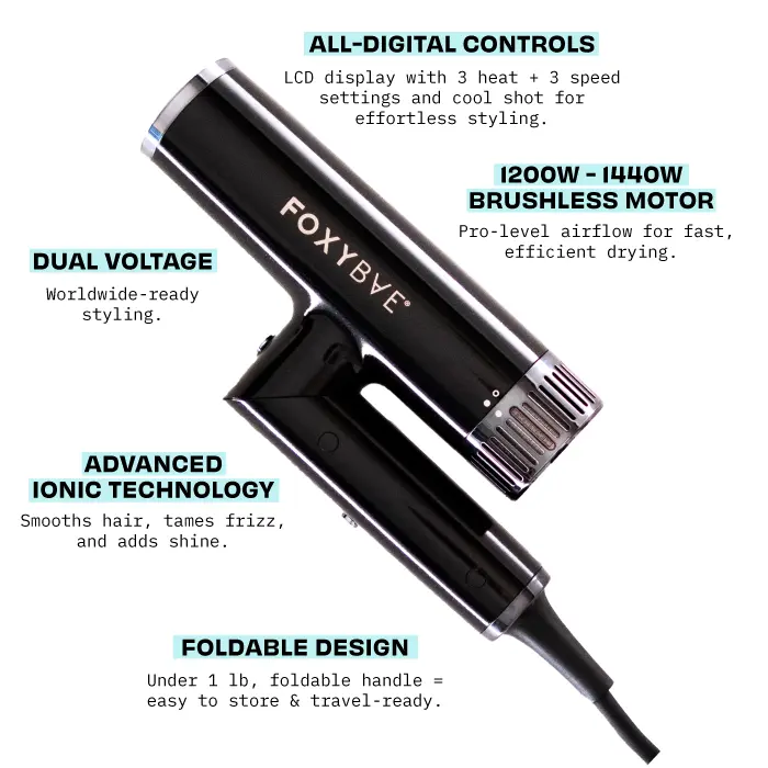 Whether you're styling in a hotel bathroom, packing light for travel, or need pro performance in a compact size, FoxyBae Globetrotter delivers salon-speed styling anytime, anywhere. Small dryer. Big results. Zero compromises.