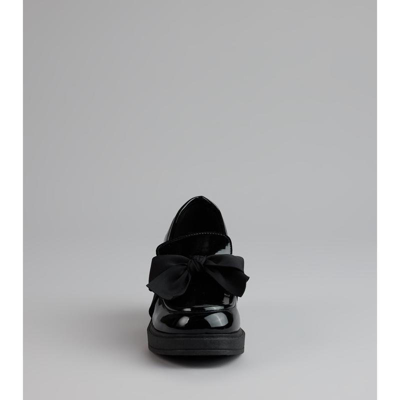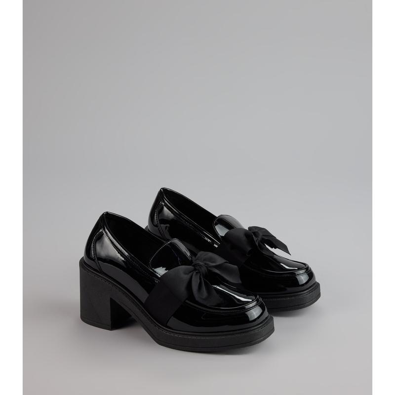 Classic meets playful—these patent loafers get a girly twist with satin bows and chunky block heels that keep them modern.