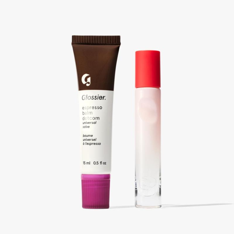 The ultimate on-the-go duo: Balm Dotcom for instant nourishment and Glossier You Travel Spray for fragrance touch-ups. Ideal for any handbag or makeup bag.