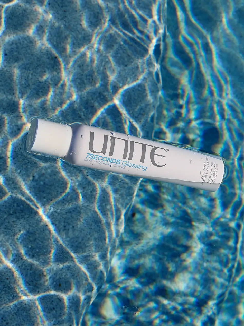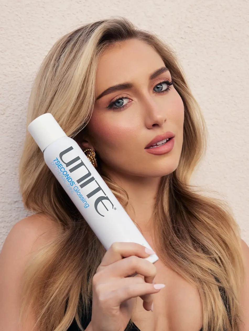 Crisp air, cozy layers, and color that pops. The anti-humectant 7SECONDS Glossing Spray shields strands from heat while amplifying shine, keeping your fall color luminous, frizz-free, and protected after every blowout, curl or flat iron session. 🎥: @Autym  #unitehair #shinyhair #haircareproducts #glossyhair