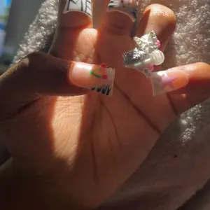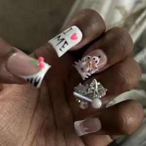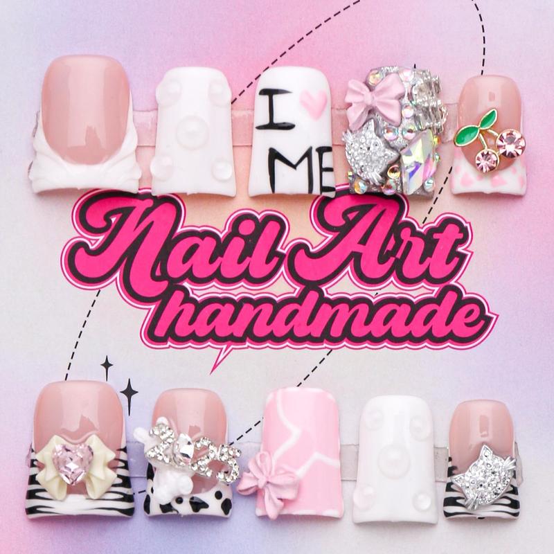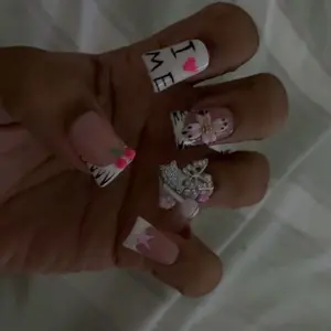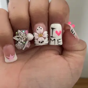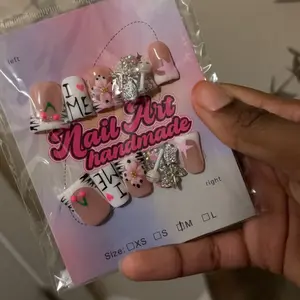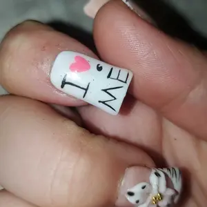 Bought these nails,super good quality,came in 2 weeks for me but mines gems came off very easy which is fine they are still really cute they also dont have glue so just know that when buying my I 💗 Me nails has a a black dot above the eye
