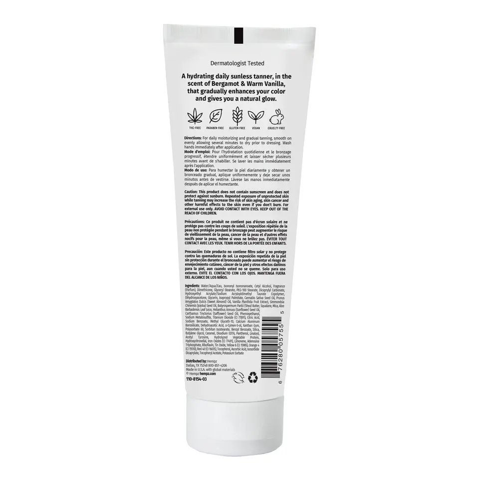 | Ingredients | Water/Aqua/Eau, Isononyl Isononanoate, Cetyl Alcohol, Fragrance (Parfum), Dimethicone, Glyceryl Stearate, PEG-100 Stearate, Dicaprylyl Carbonate, Hydroxyethyl Acrylate/Sodium Acryloyldimethyl Taurate Copolymer, Dihydroxyacetone, Glycerin, Isopropyl Palmitate, Cannabis Sativa Seed Oil, Prunus Amygdalus Dulcis (Sweet Almond) Oil, Vanilla Planifolia Fruit Extract, Simmondsia Chinensis (Jojoba) Seed Oil, Butyrospermum Parkii (Shea) Butter, Squalane, Mica, Aloe Barbadensis Leaf Juice, Helianthus Annuus (Sunflower) Seed Oil, Carthamus Tinctorius (Safflower) Seed Oil, Phenoxyethanol, Sodium Metabisulfite, Titanium Dioxide (CI 77891), Citric Acid, Sodium Benzoate, Methyl Gluceth-10, Calcium Aluminum Borosilicate, Dehydroacetic Acid, o-Cymen-5-ol, Xanthan Gum, Polysorbate 60, Sorbitan Isostearate, Benzyl Benzoate, Silica, Butylene Glycol, Caramel, Disodium EDTA, Panthenol, Linalool, Acetyl Tyrosine, Hydrolyzed Vegetable Protein, Hydroxycitronellal, Iron Oxides (CI 77491), Limonene, Adenosine Triphosphate, Riboflavin, Tin Oxide, Yellow 6 (CI 15985), Orange 4 (CI 15510), Red 40 (CI 16035), Tocopherol, Ascorbic Acid, Isosorbide Dicaprylate, Tocopheryl Acetate, Potassium Sorbate |