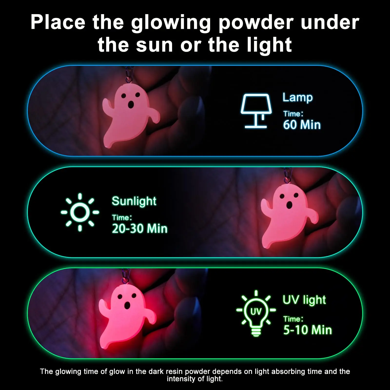 ·HOW TO USE: After receiving the goods, place epoxy glow powder under the light under sunlight or strong light for 20-30 minutes(shorter light time needed under UV light), and you will see the luminous powder become brighter.