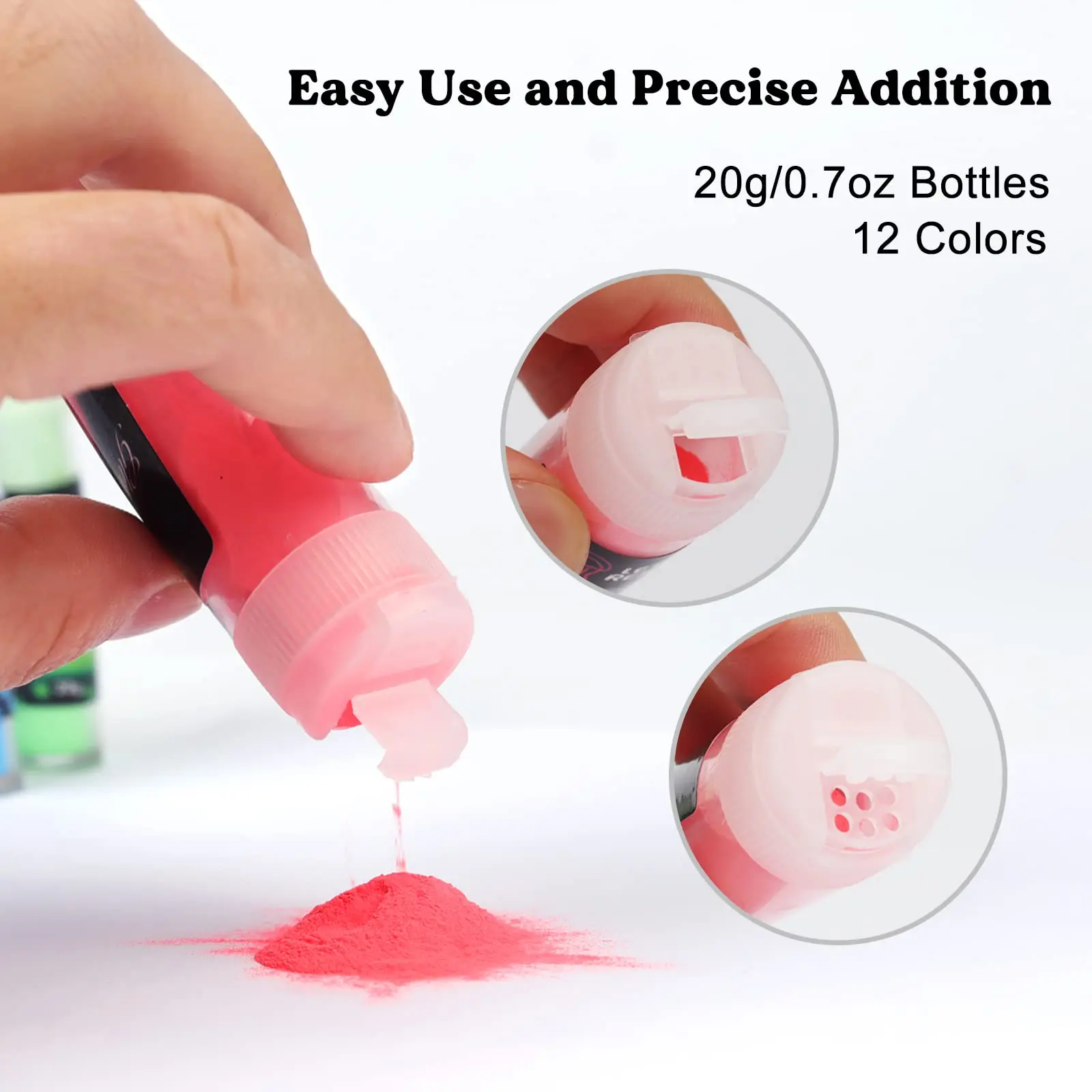 ·MULTI-COLORS GLOW PIGMENT POWDER: 12 vivid colors glow in the dark powder, including magenta, coral, fuchsia, sky blue, blue-green, yellow, green, salmon, purple, gold, yellow-green, blue. Compare to others, this luminous pigment powder set has a larger capacity, each color has 0.7oz/20g.