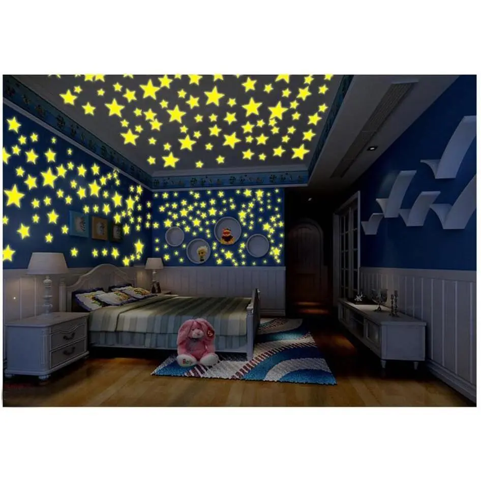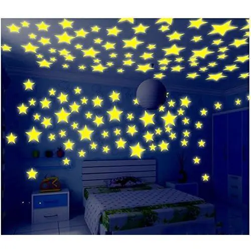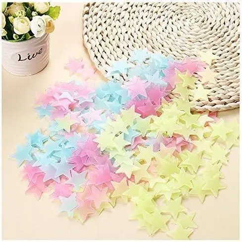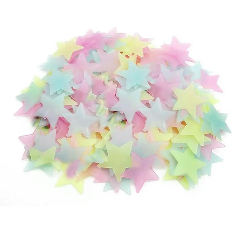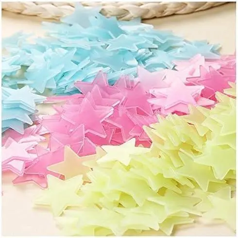 Material:PVC Plastic,luminous powder;Star diameter: 3cm/1.18"; Color:Mixed Color;Package:100pcs of each order Comes with sponge double-sided stickers, removable and will leave no residue or damage when peel off from wall or window Can be used on almost all surfaces, such as wall, glass, tiles, wood and more Easy to use,put the sticker under the light source absorb it for 15-30 minutes, turn your lights off and glowing in the dark Fun for decorating the bedrooms with a perfect representation of the night sky,great for bedrooms, nursery rooms, kid's room etc