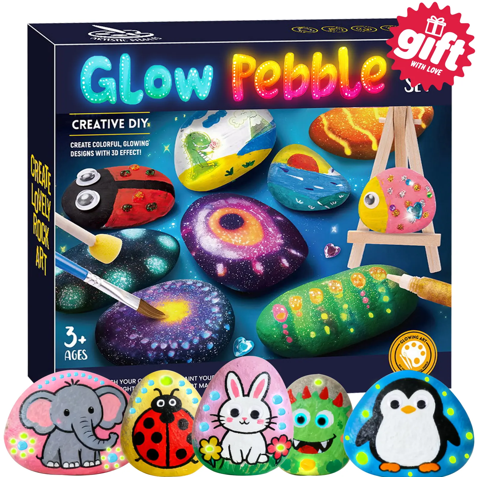 SUPER VALUE. This DIY Craft Rock Set includes 10 rocks, 12 standard paints, 4 brushes,2 sponge brushes, 100 gems, 10 transfer stickers, 12 googly eyes, 4 glitter glue, 3 luminous pigments, 1 color palette
